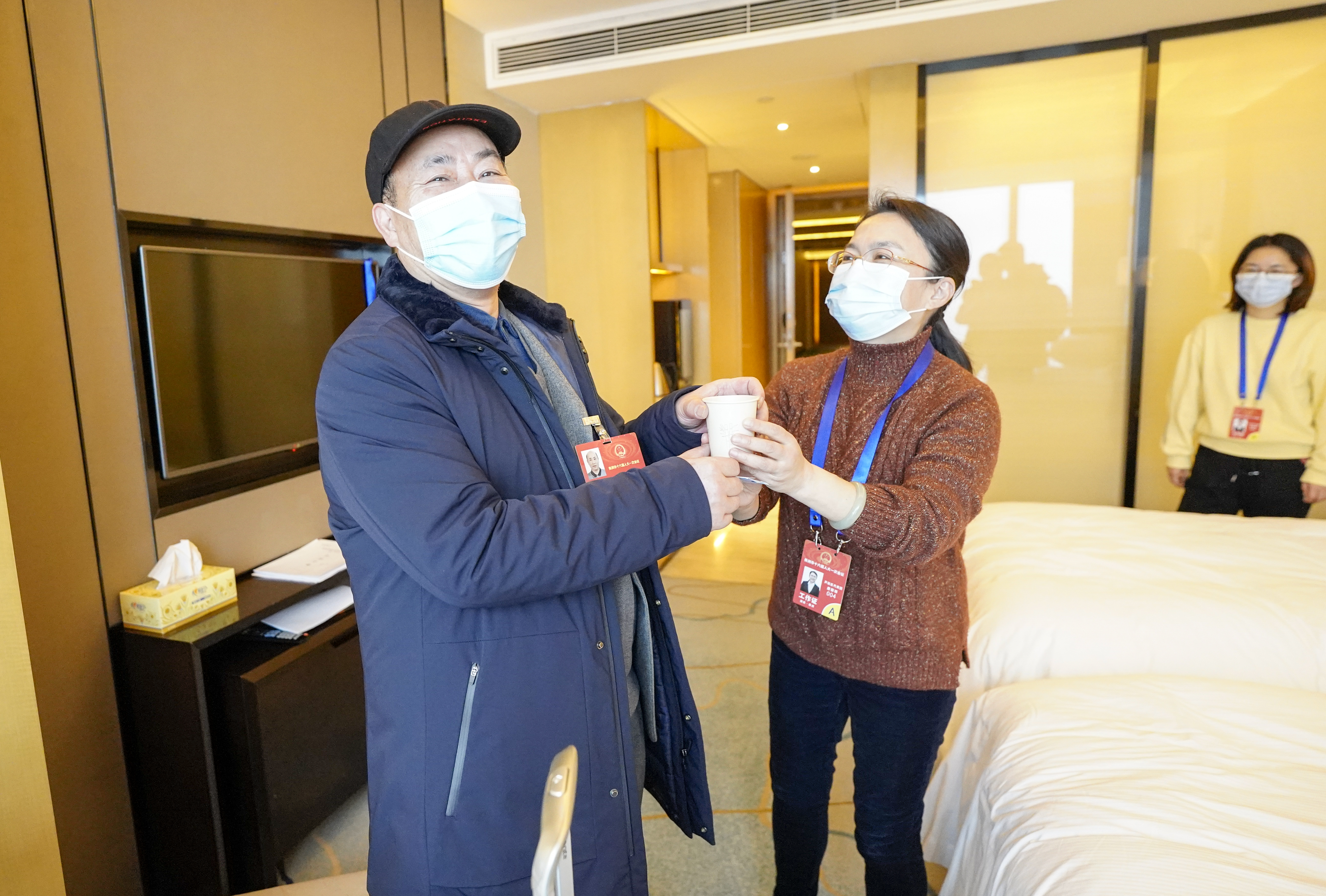 12月28日,在人大代表驻地,工作人员为前来报到的人大代表送上一杯热茶。