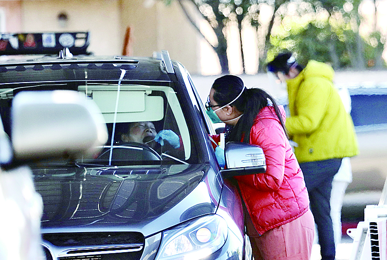 1月2日,医护人员在美国加利福尼亚州洛杉矶县一处新冠病毒检测站为居民做检测。 美国洛杉矶县近期新冠疫情严峻。当地卫生部门说,洛杉矶县1月1日、2日共新增近4.5万新冠病例,接受新冠检测的人中超过20%为阳性。洛杉矶县是美国人口最多的一个县,居民超过1000万。