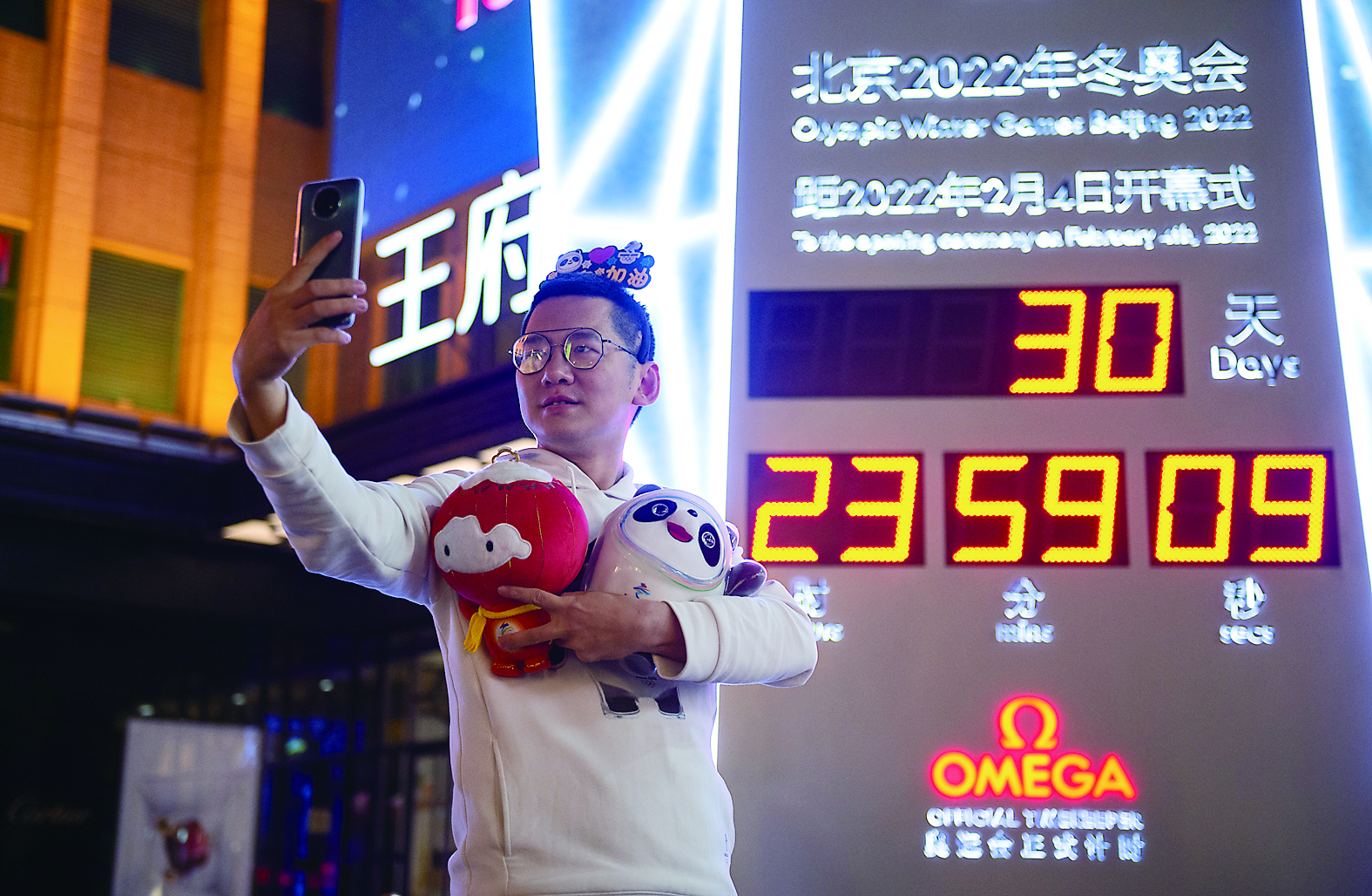 1月4日,一位市民在位于北京王府井大街的北京2022年冬奥会倒计时牌前自拍。当日,北京2022年冬奥会迎来开幕倒计时一个月。新华社发