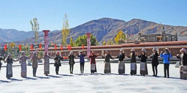 在扎囊县株洲广场,当地居民跳起欢快的舞蹈。