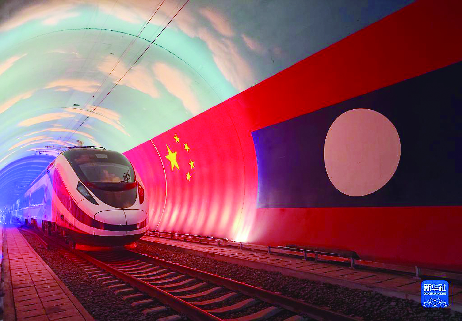 2021年10月15日,“澜沧号”动车组通过中老友谊隧道内的两国边界。