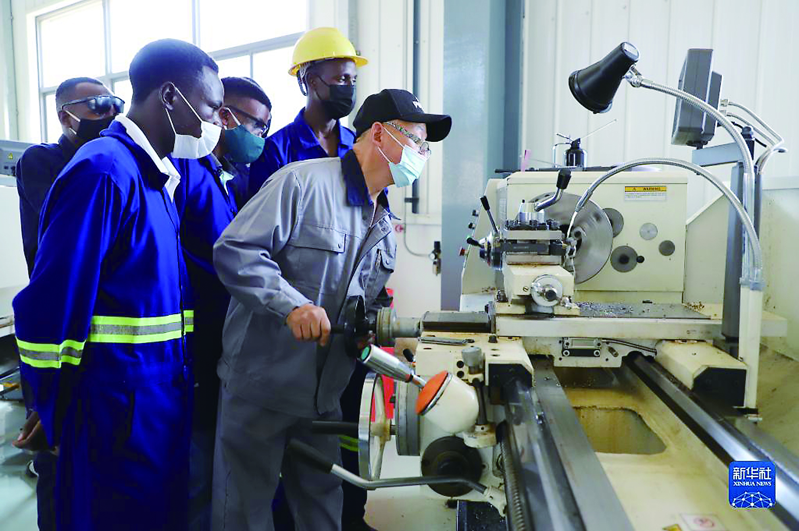 2021年11月9日,在位于乌干达中部穆科诺地区纳曼韦工业园的中国援乌工业技能培训与生产中心,一名中方导师为学员演示如何操作机械。