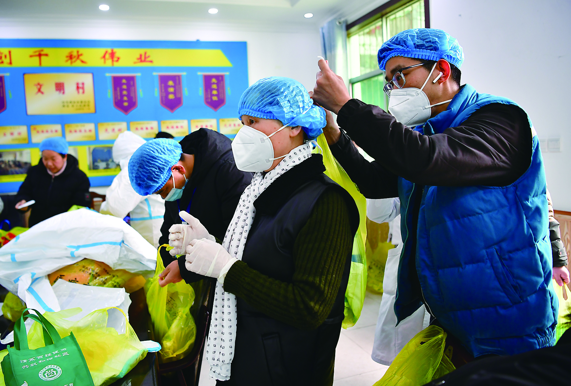 近日,在西安市长安区郭杜街道周家庄村村委会,医护人员在穿戴防护用具。 新华社记者 邵瑞 摄