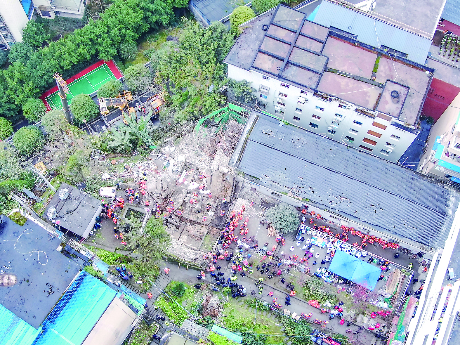 据“重庆发布”微博消息,1月7日12时10分,重庆市武隆区凤山街道办事处食堂发生垮塌,疑似食堂燃气泄漏燃爆,造成20余人被困。截至发稿时,已搜救出被困人员20人,其中9人因抢救无效死亡,其余人员正在全力救治。记者7日从应急管理部获悉,应急管理部已派出工作组和专家赶赴现场指导救援处置工作。这是1月7日拍摄的重庆市武隆区凤山街道办事处食堂垮塌现场(无人机照片)。