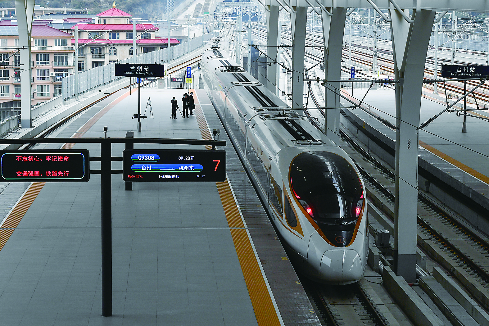 1月8日,随着两趟首发列车同时从台州站、嵊州新昌站开出,分别驶向杭州方向、温岭方向,我国首条民营控股高铁——杭台高铁开通运营,这一铁路投融资体制改革示范项目正式进入运营阶段。据悉,杭台高铁是我国首批8个社会资本投资铁路示范项目之一。该项目可研批复总投资448.9亿元,其中民营联合体占股51%。杭台高铁连接浙江省杭州、绍兴、台州三市,全线长266.9公里,设计时速350公里,设绍兴北、台州、温岭等8个车站。通车后,杭州与台州之间最快63分钟可达。图为1月8日在台州站拍摄的杭台高铁首发列车。