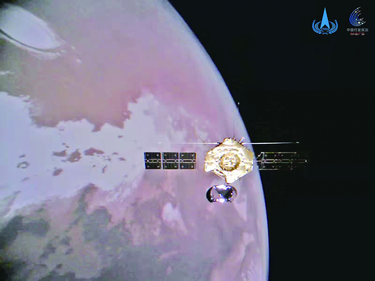 2022年元旦,国家航天局发布我国首次火星探测任务天问一号探测器从遥远火星传回的一组精美图像,向全国人民报告平安。本组图像包含环绕器与火星合影、环绕器局部特写、火星北极冰盖、“祝融号”火星车拍摄火面地貌等内容,展示环绕器、“祝融号”火星车工作状态及获取的火星表面形态。这是环绕器与火星合影。