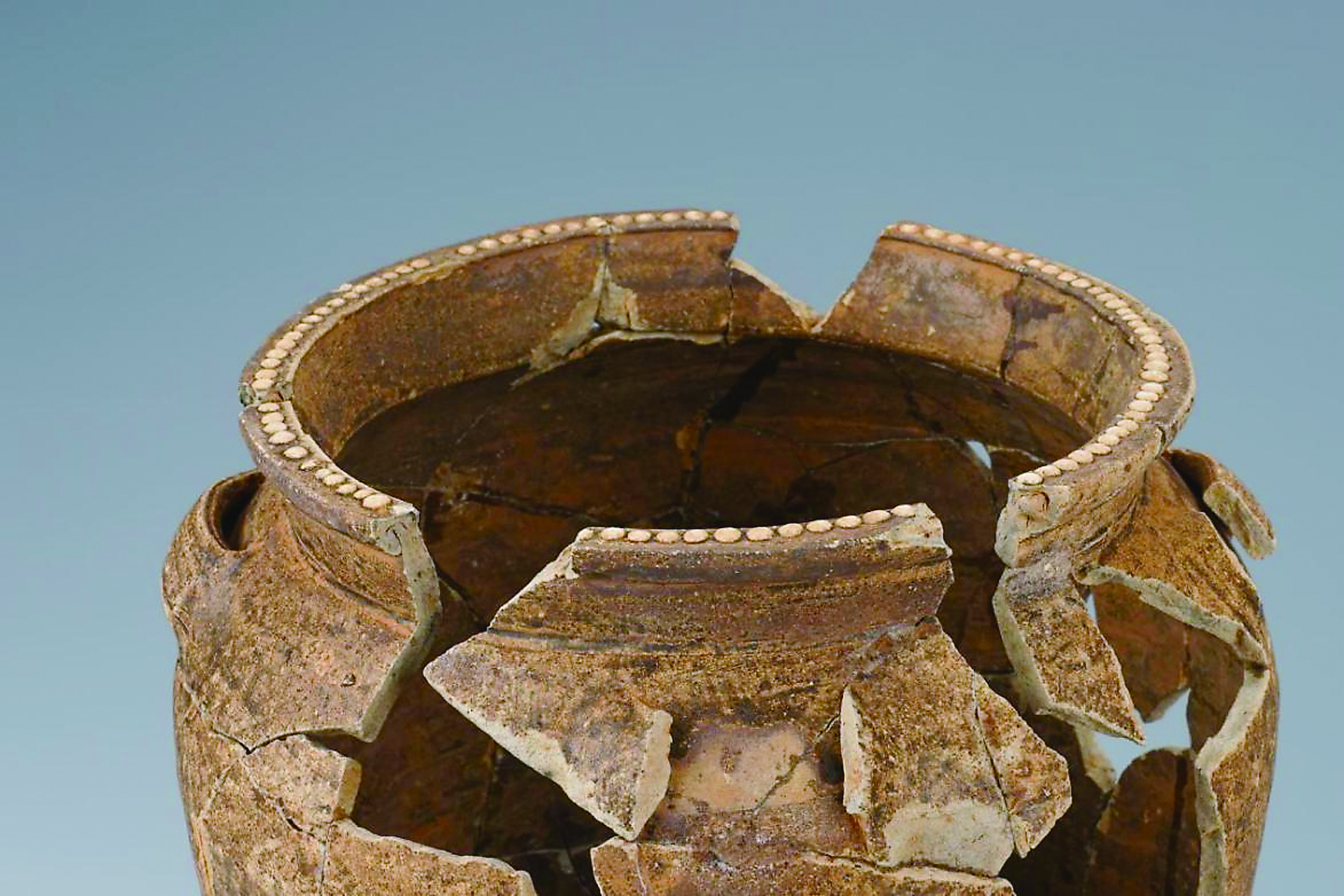 北海市博物馆近日发布最新考古成果称,考古工作者在北海市银海区福成镇古城村委大树根村发现7万平方米古墓葬群,初步调查勘探大树根古墓群约有200座古墓,专家推测该墓葬群的年代约在六朝至隋唐时期,具有较高的研究价值。据介绍,该墓葬群最突出的特征是墓室普遍采用一种俗称“砂轮片”的石片构筑,也有部分墓葬以砖石合构,形制狭长而浅。墓地采集遗物有陶器、瓷器、铁器等类,可辨器形有硬陶四系罐、夹砂陶釜、青瓷碗、铁刀。图为大树根古墓群周边采集的乳钉纹陶器。