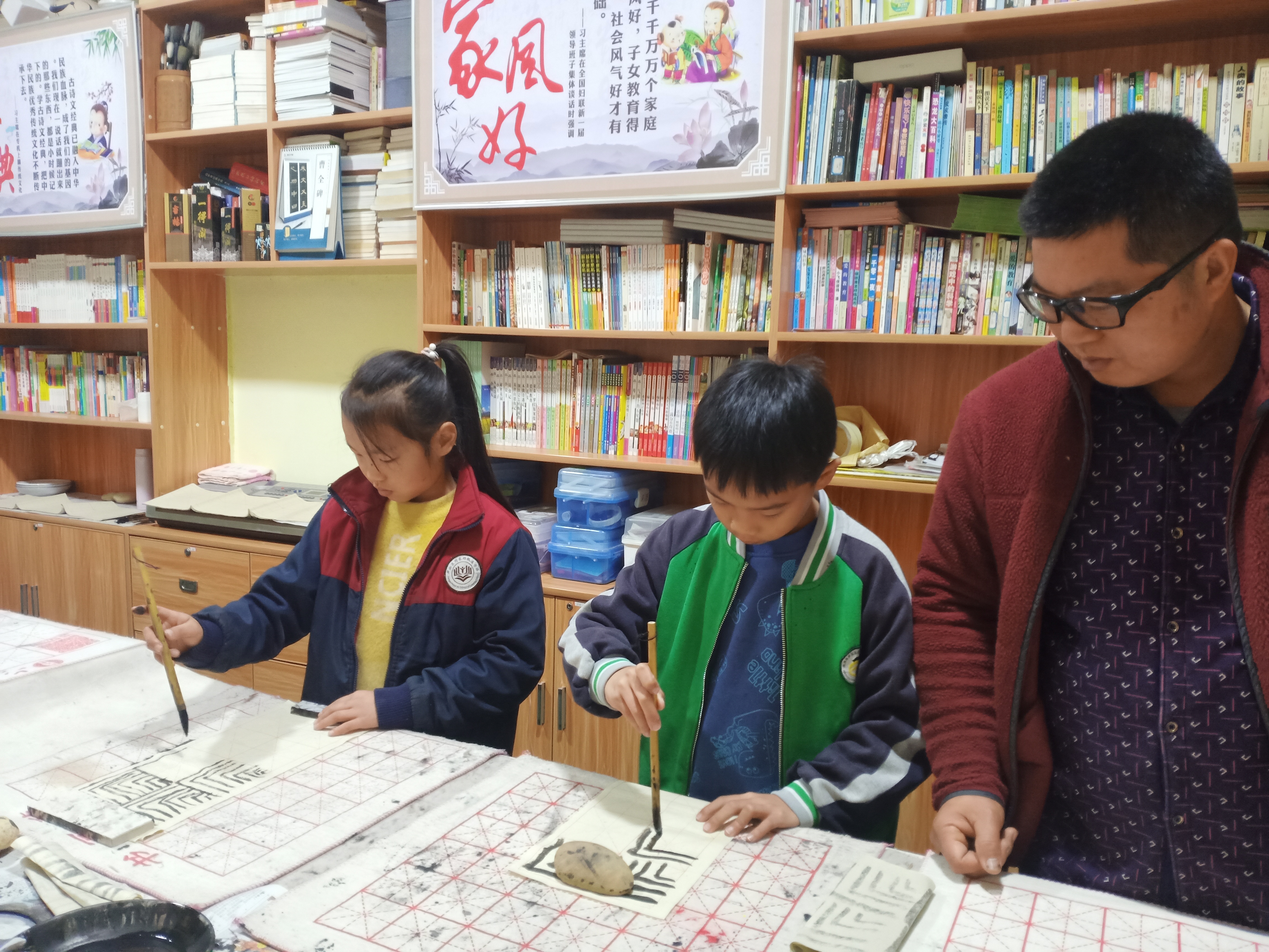 罗立新在教孩子们书画。受访者供图