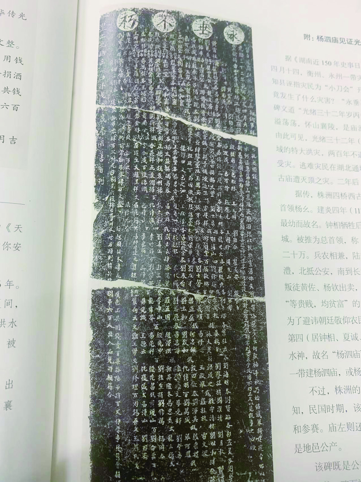 遗憾的是,由于史料匮乏,我们并不知晓杨泗庙废于何时。倒是在修天元大桥之前,周边住户搬迁之后,在残垣断壁间发现了一块已断裂成为三截的石碑,石碑系清光绪三十四年(1908年)所立,为重修杨泗庙后的捐项功德并收支公开,不但叙重修杨泗庙之缘起,更重要的是,碑中还记述了百年前湘江流域那场罕见的大洪灾。