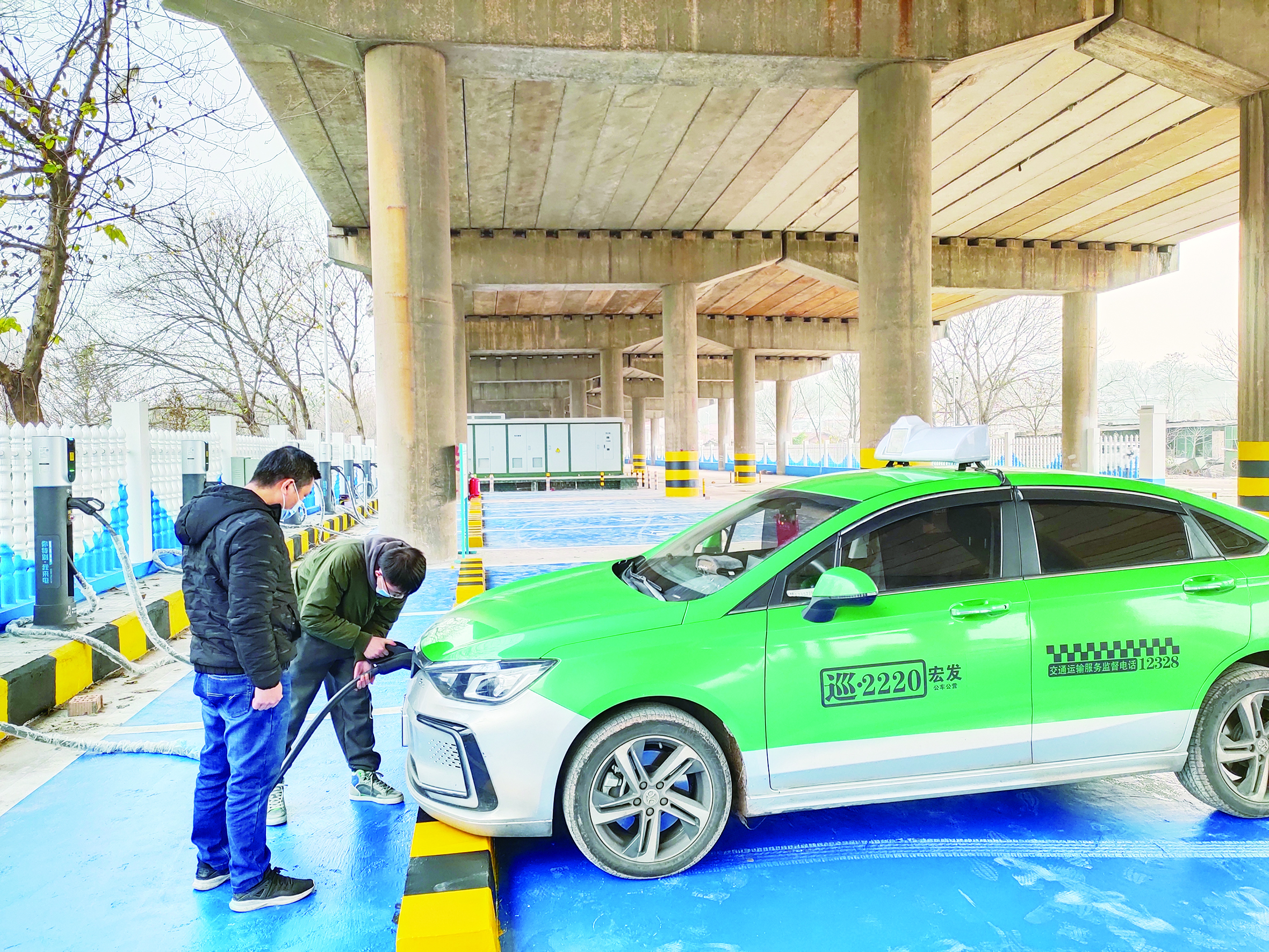 1月11日,市民在我市最大的集中式充电站给新能源车充电。这个充电站位于石峰大桥河西桥下(新东路旁),能同时容纳54辆车快充和7辆车慢充。未来,该充电站还能提供新能源物流车、公交车、环卫车等各种车型的充电。