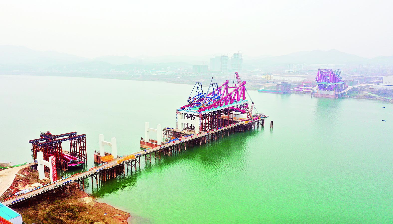 1月13日,湘江一江碧水,清水塘大桥建设正全力推进。 清水塘大桥是我市第一座双层钢桁架拱桥。目前,大桥下部结构承台、墩柱施工已完成90%,大桥上部结构现浇箱梁南北引桥完成60%,大桥上部钢结构南北岸边跨安装完成。大桥计划将于今年内建成通车。