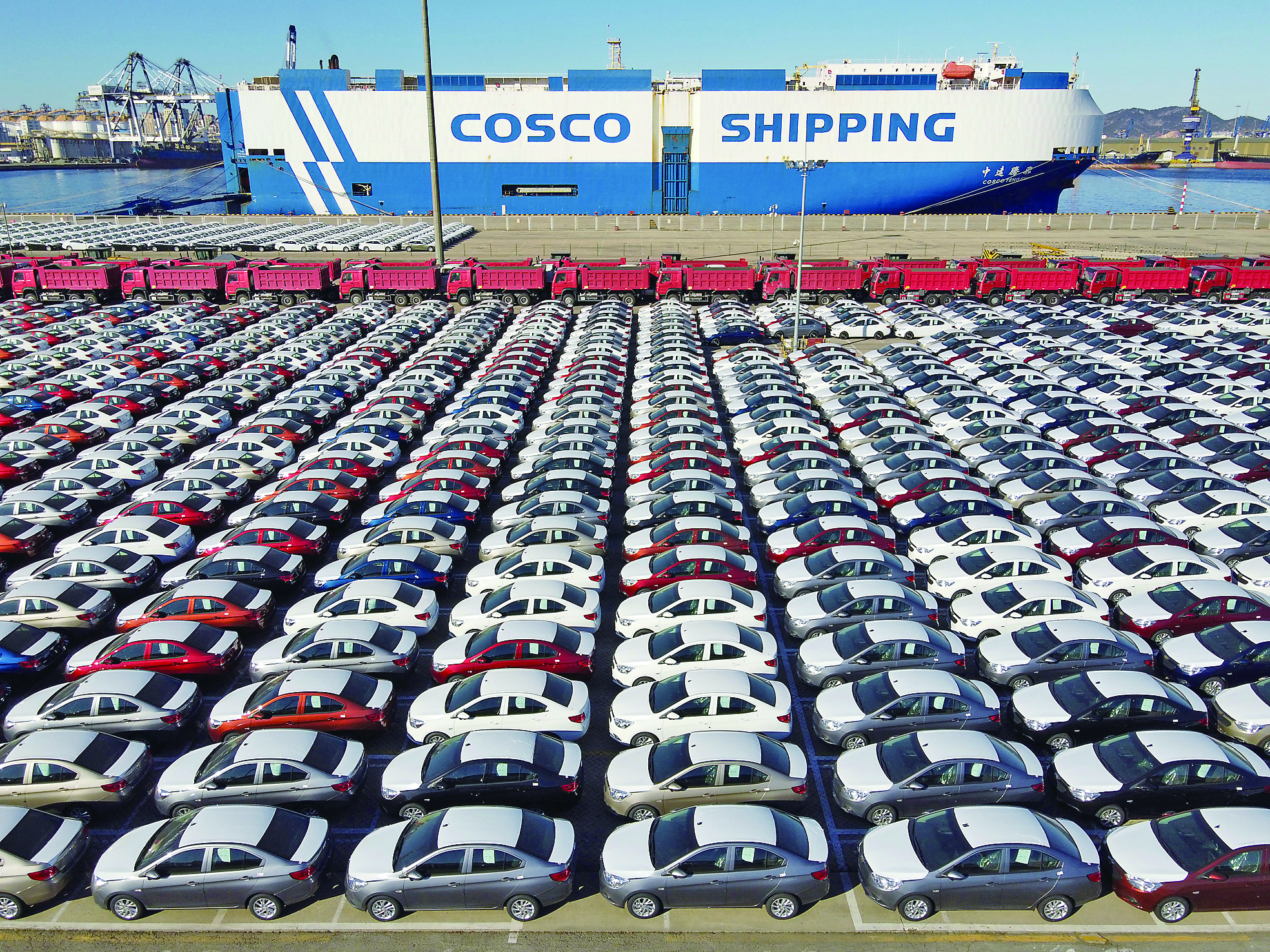 大批出口商品车在山东港口烟台港集结等待装船。 新华社发(唐克 摄)