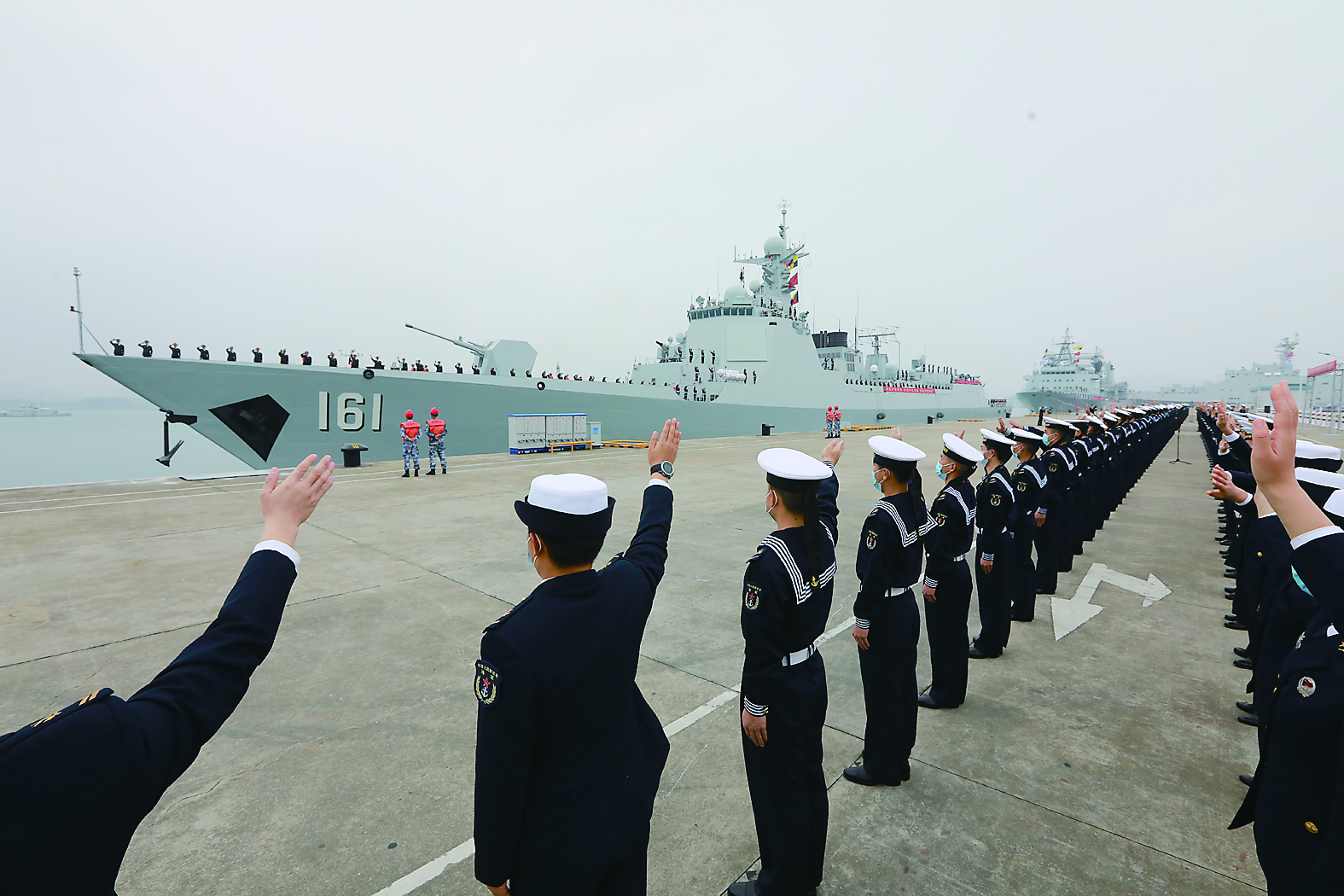 图为1月15日,中国海军第40批护航编队从广东湛江某军港解缆起航,官兵们在码头挥手送别。