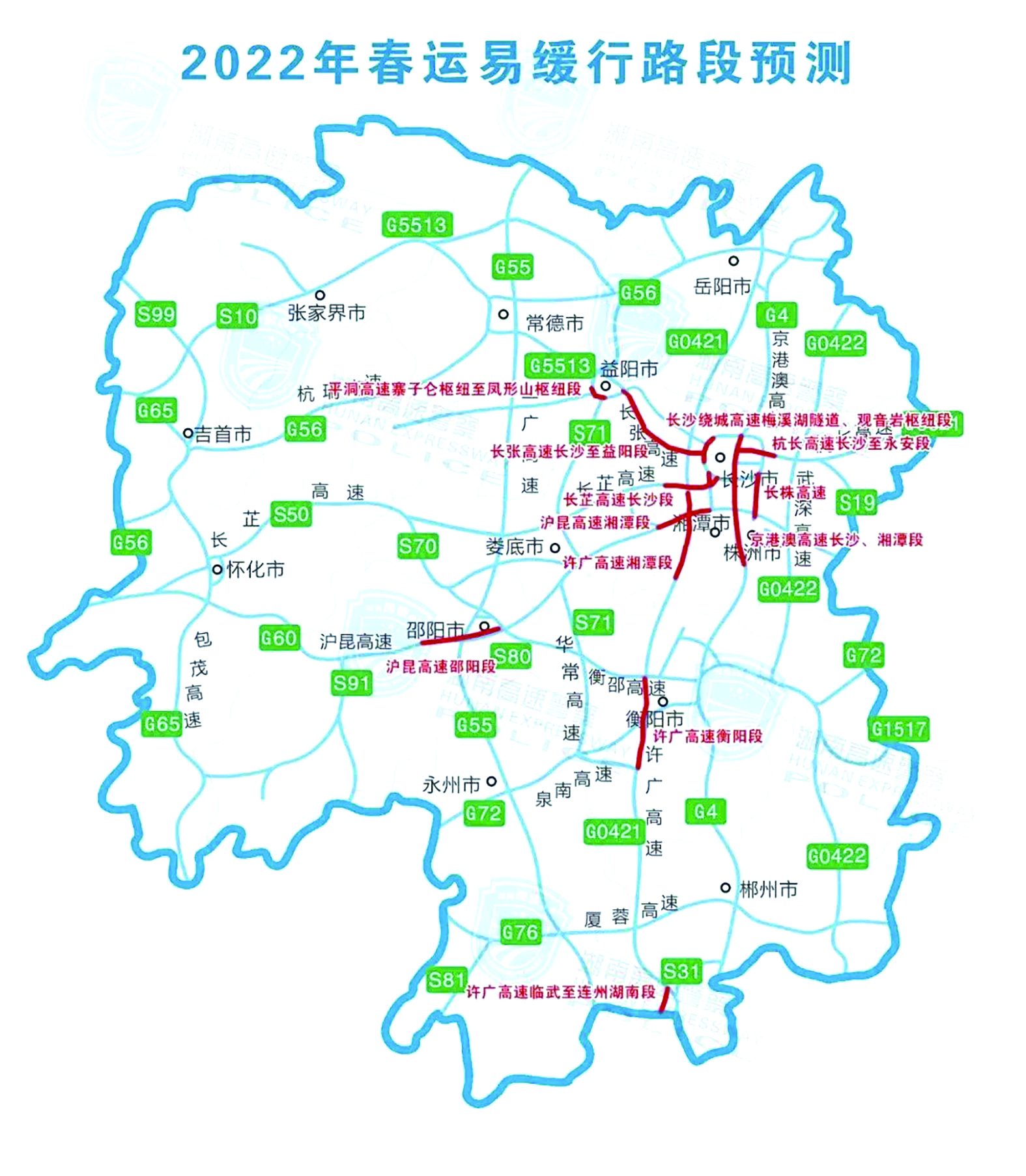 湖南境内高速公路缓行易堵路段预测。 通讯员供图 缓行易堵,经过这些路段要注意