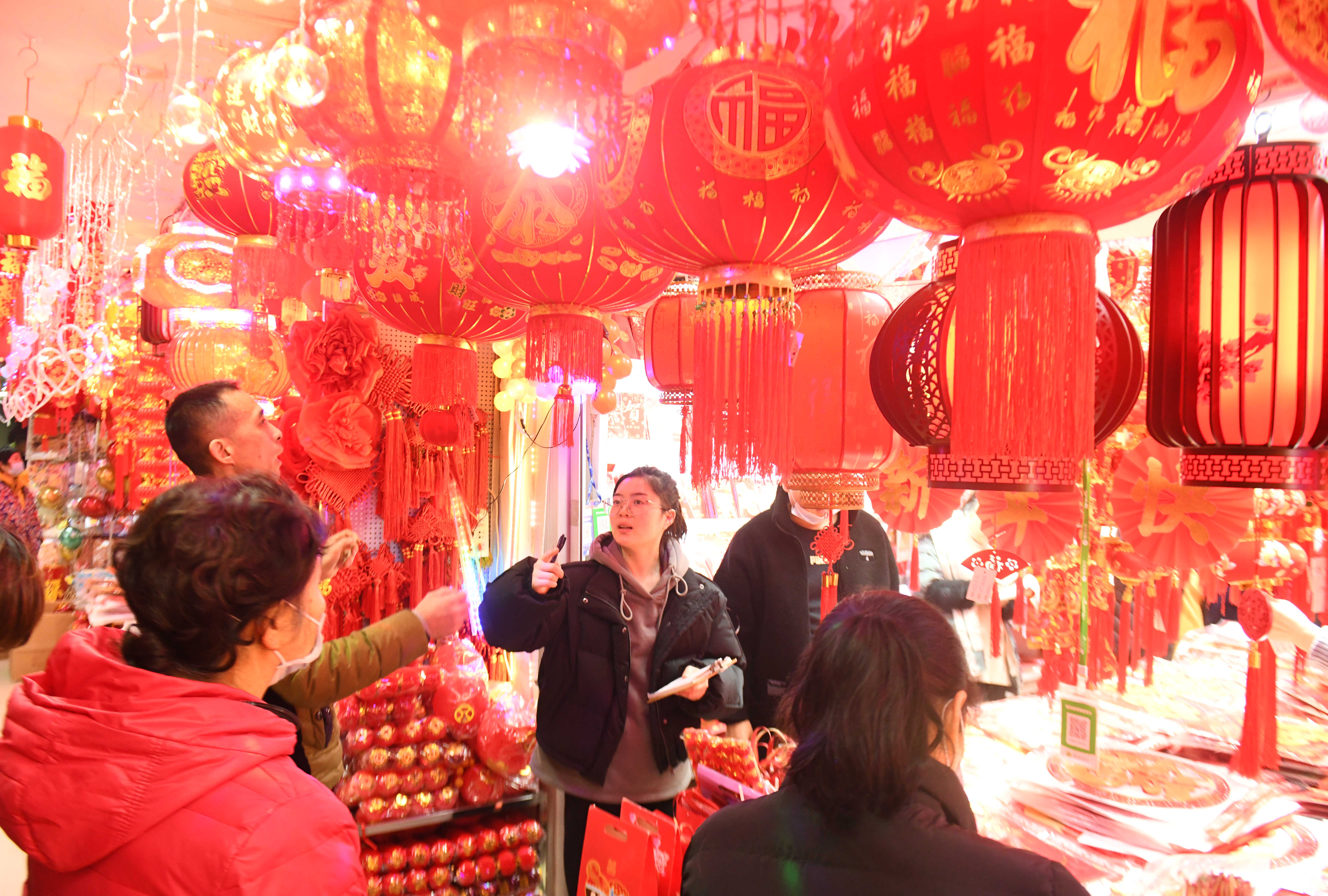 农历虎年新春将至,年俗商品市场火爆。1月19日,在南大门小商品市场年俗商品专卖区,不少市民前来挑选灯笼、春联、窗花等节日装饰品,用来点缀火红的新年。