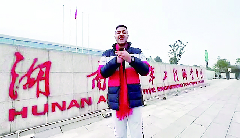 1月20日,湖南汽车工程职业学院孟加拉留学生习飞特在学校门口唱中国歌贺新年,祝福株洲人民新年好。