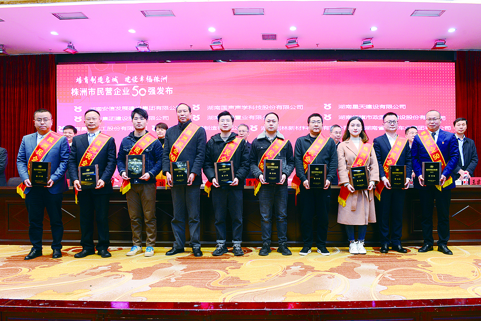 ▲1月14日,全市民营经济统战工作会议暨民营经济高质量发展大会上,我市对2021株洲民营企业50强进行表彰。通讯员供图