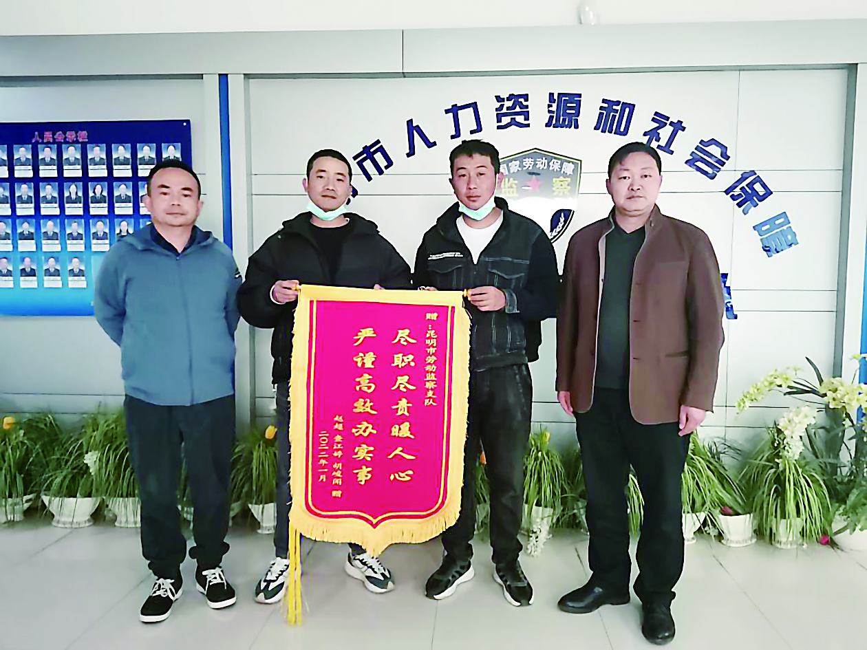 2022年1月10日,两位农民工向帮助其讨薪的昆明市劳动监察支队送来锦旗。 (云南省人力资源和社会保障厅供图)