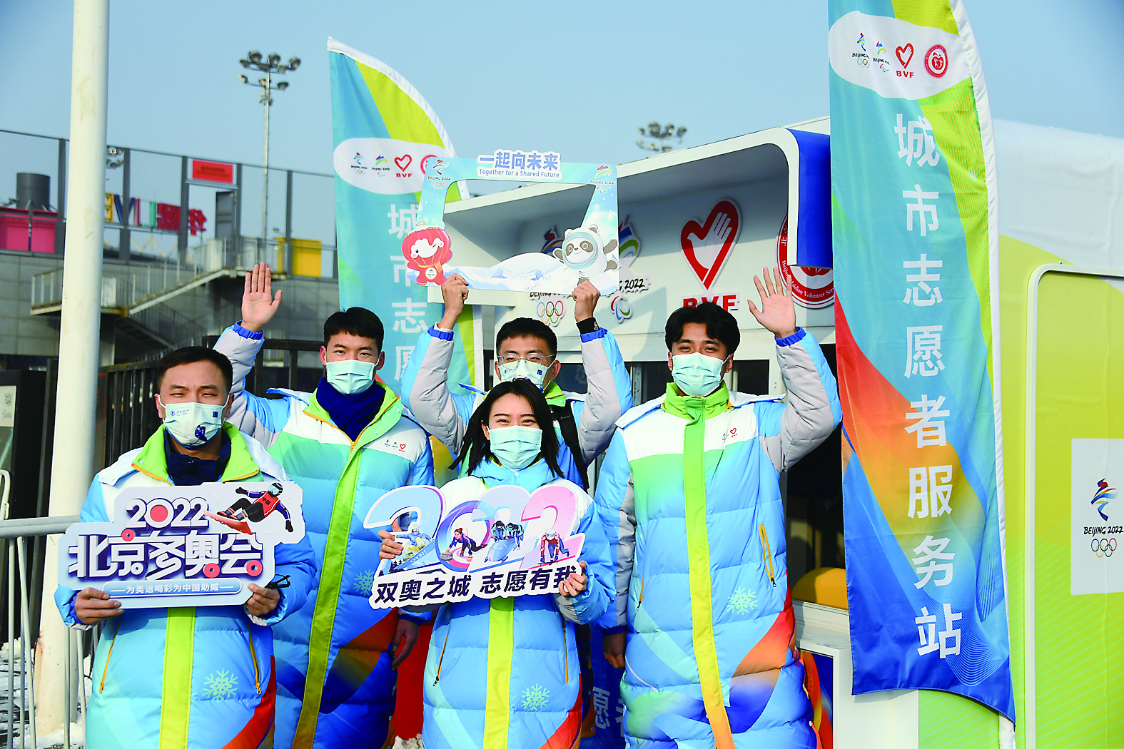 图为城市志愿者代表当日在五棵松体育中心附近的城市志愿者服务站合影。 新华社记者 任超 摄