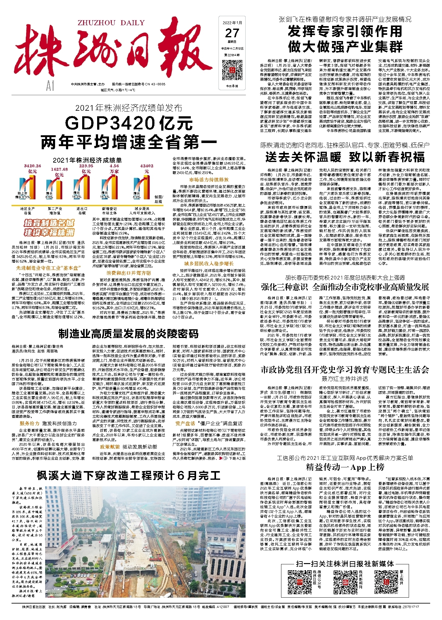株洲日报·掌上株洲讯(记者/陈正明) 1月26日,省人大常委会党组副书记、副主任张剑飞来到株洲看望慰问专家,并调研产业发展情况。市委书记曹慧泉陪同。