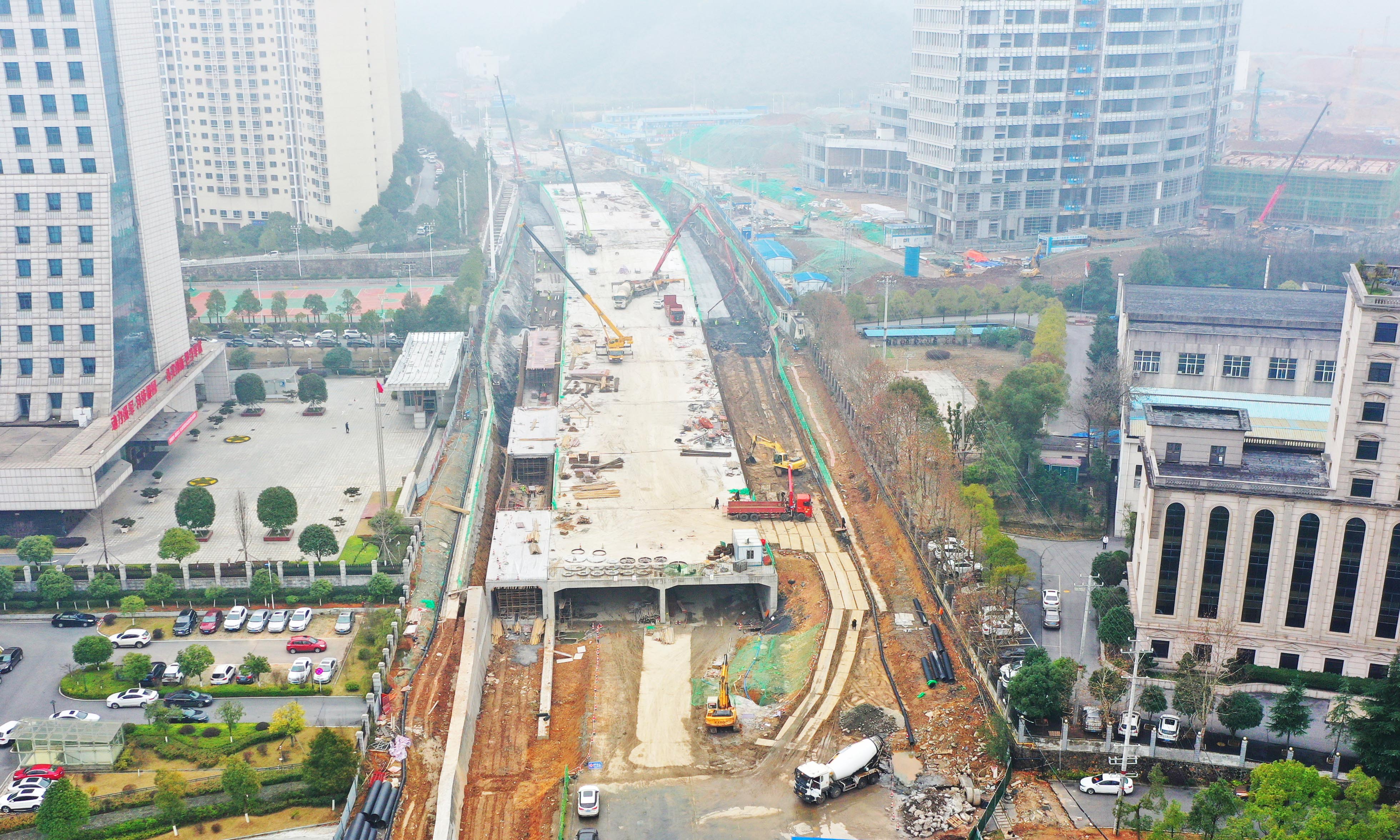 目前,地道围护桩、冠梁、地道主体工程垫层等均已完成,正在进行行人和非机动车通道东侧主体结构施工。整体进度完成65%,预计今年6月底全部完成。图为建设现场近日航拍画面。