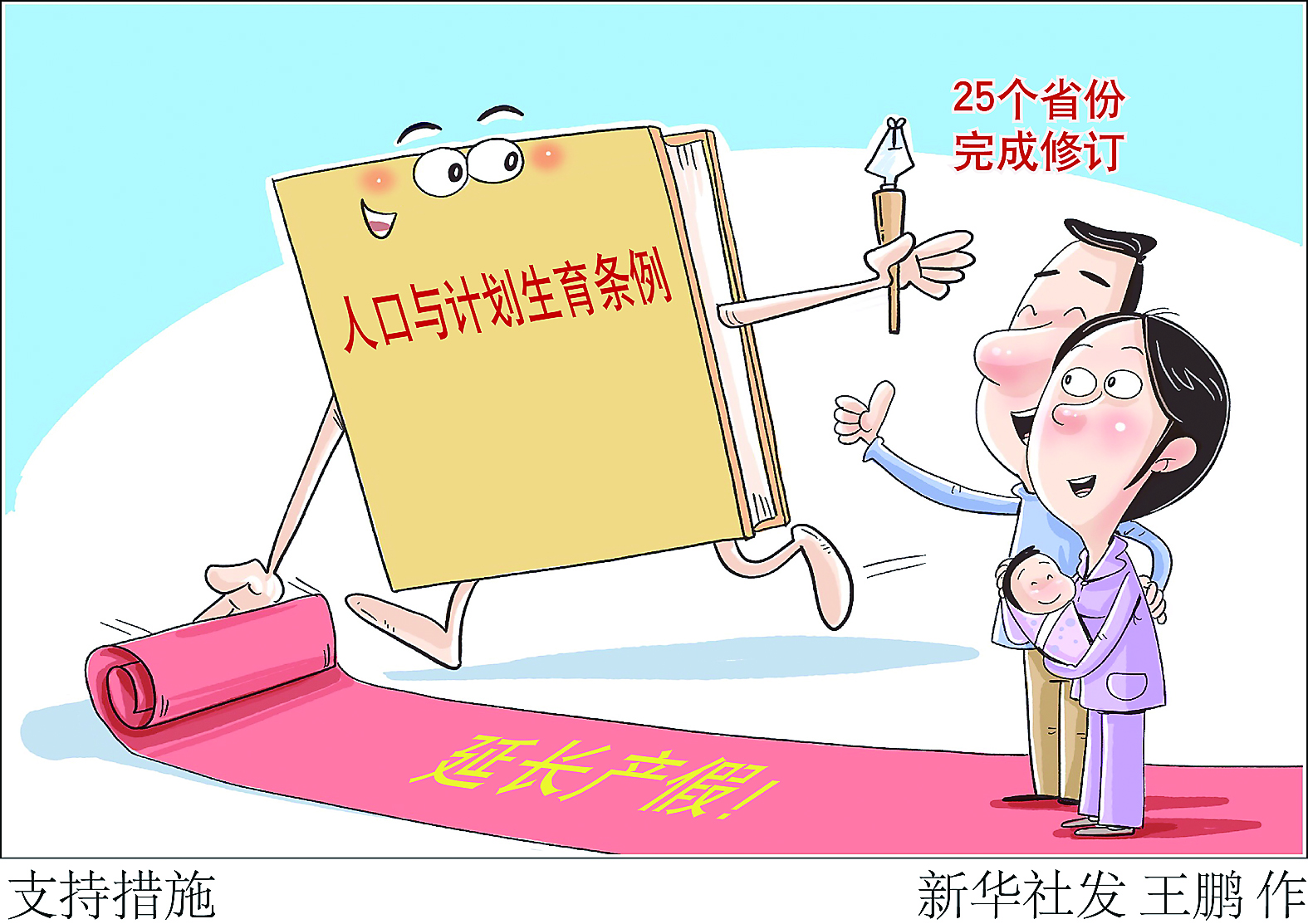 三是各地依法组织实施三孩生育政策,积极出台支持措施。目前25个省份完成条例修订,部分省份已制订实施方案。从现有情况看,各地普遍延长产假30-90天,增加普惠托育服务发展、计划生育家庭权益保障等条款。浙江将构建育儿友好型社会作为重大改革举措纳入共同富裕先行示范区建设,苏州市计划财政投入4亿元用于促进普惠托育发展,攀枝花市完善生育服务体系、探索发放生育津贴,等等。
