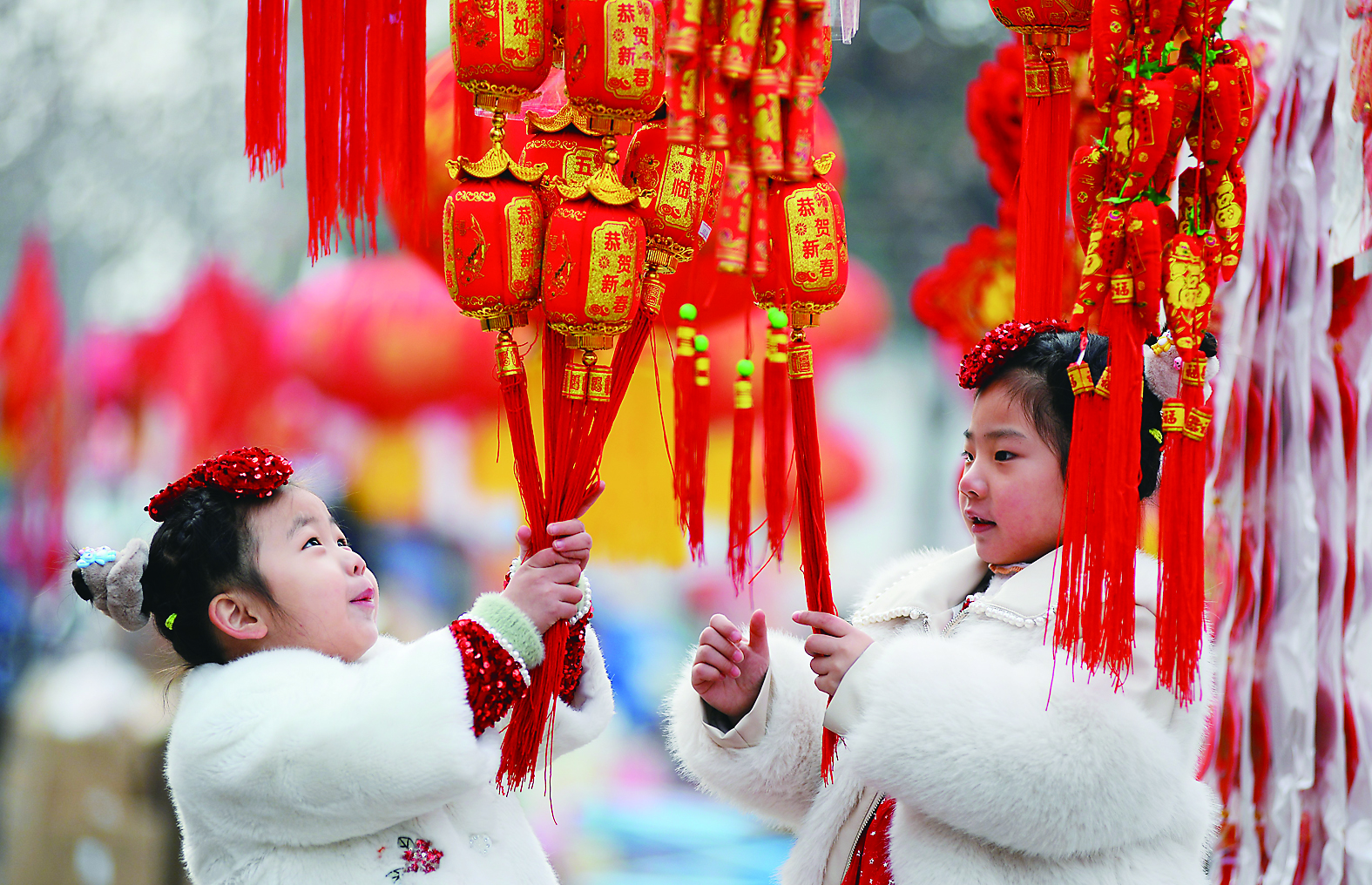 1月25日,小朋友在山东省滕州市年集市场玩耍。当日是农历小年,人们购买年货,张灯结彩,举行形式多样的庆祝活动,年味渐浓。 新华社发(李志军 摄)