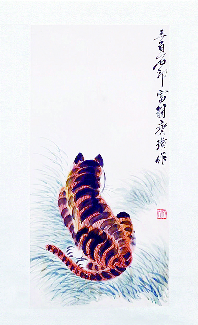 齐白石很少画虎,他的画以果蔬、花卉、人物以及鱼虾蟹类题材居多,也最为人称道,他画虎的作品极为少见,仅有的虎图也是以虎背著称。故宫博物院于1957年收藏了齐白石的一幅《虎图》,这幅画打破了传统画作中以虎的正面形象面向观众的画法,而是把虎的背影留给观众。仔细观看《虎图》,可以看到虎背在扭动,其身躯健壮、强悍,尾巴自然弯曲于身侧。两旁秋草随风摇曳,此虎却不为周围环境所动,显出唯我独尊的王者风范。