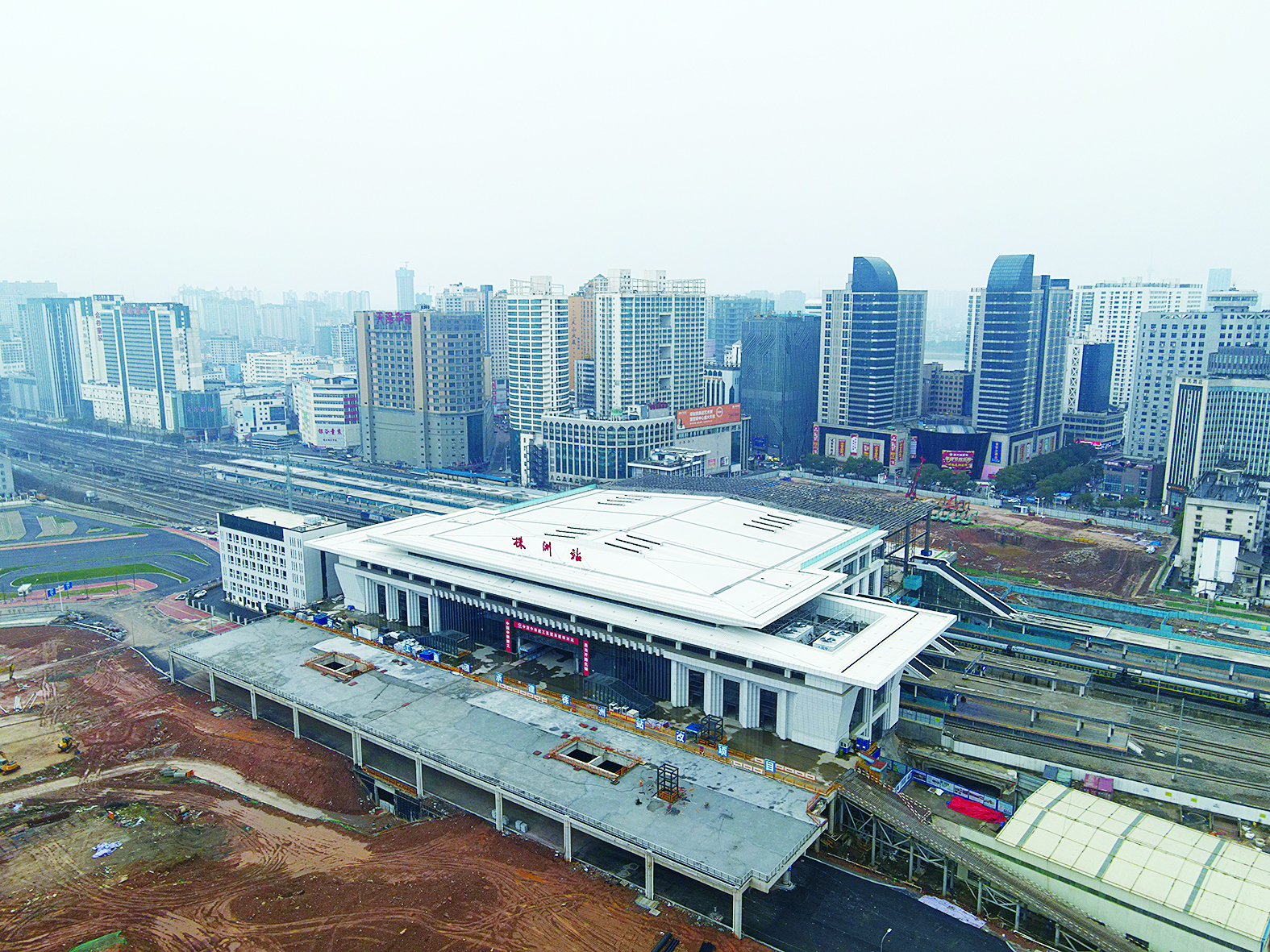 2月6日,冬雨淅淅,在株洲站改扩建施工现场,东站台正在进行三、四站台间高架候车厅钢结构桁架施工和檩条安装。根据计划,这些钢结构将于本月15日前推进至三站台上空。