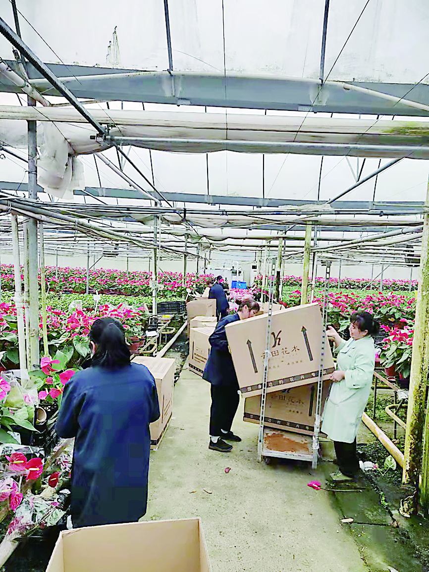 云田花卉生产基地内,工人正将打包好的花卉成品装车,发往各地。 株洲日报·掌上株洲记者/李逸峰 通讯员/宾智平 摄