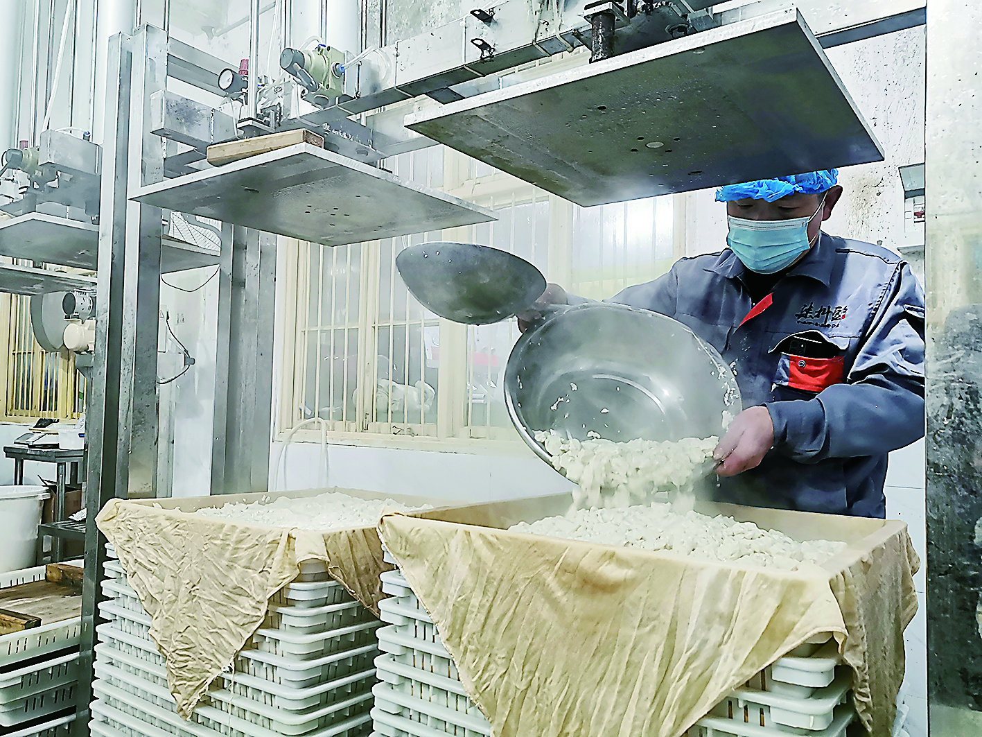 浸泡、筛选、磨豆、煮浆、凝固,接下来是做豆腐的关键一环——压榨成形。一锅煮好的豆腐脑,需要用纱布包裹,放在模具内接受压榨机一次次的挤压,用多大力度、挤压多少次,全凭制作者的经验。