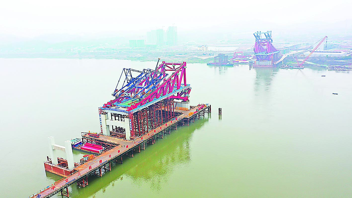 2月16日, 清水塘大桥建设进行主拱杆件吊装。该项目于2月8日(农历正月初八)复工,南北岸共有80多名工人施工。目前,北岸爬拱吊机正在进行主拱杆件吊装,南岸在安装主拱杆件和爬拱吊机调试。预计2022年底主桥贯通。