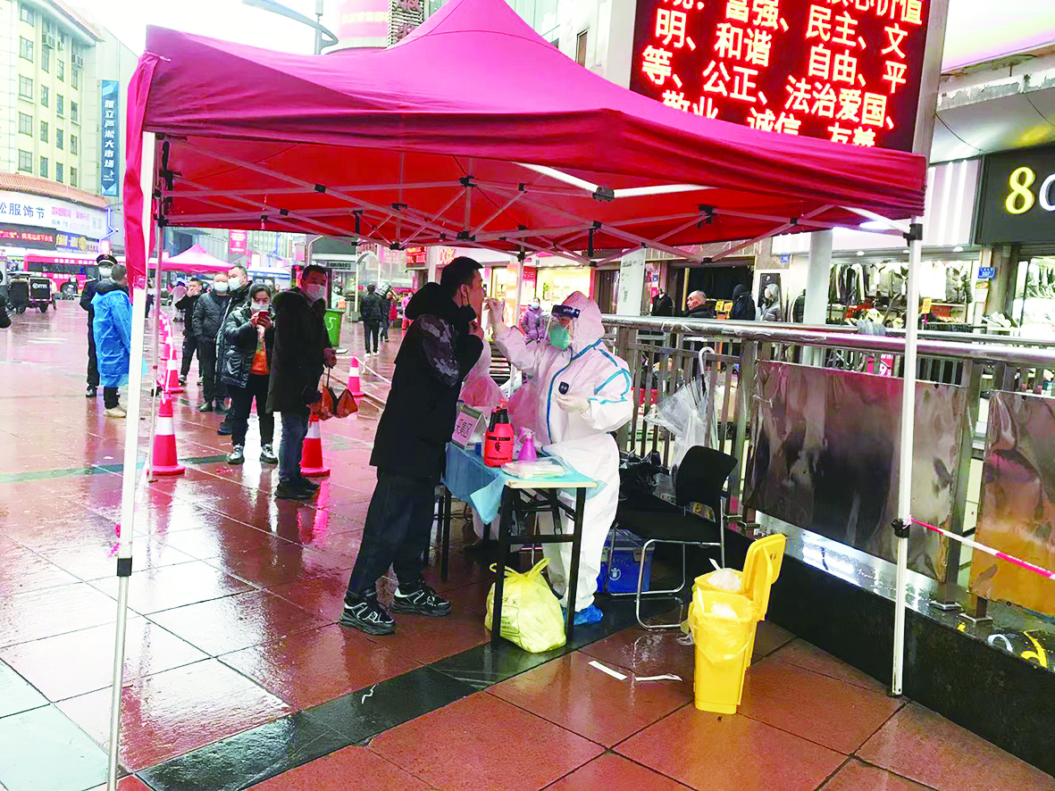 2月17日,记者在智超市场门口看见,在市场里上班的经营户在一楼排队等待核酸采集。检测点现场设置了测温区、等候区、登记区、采样区、缓冲区、临时隔离区等。3名医务人员严格执行检测流程,党员和市场服务中心工作人员在现场宣传引导、维持秩序。