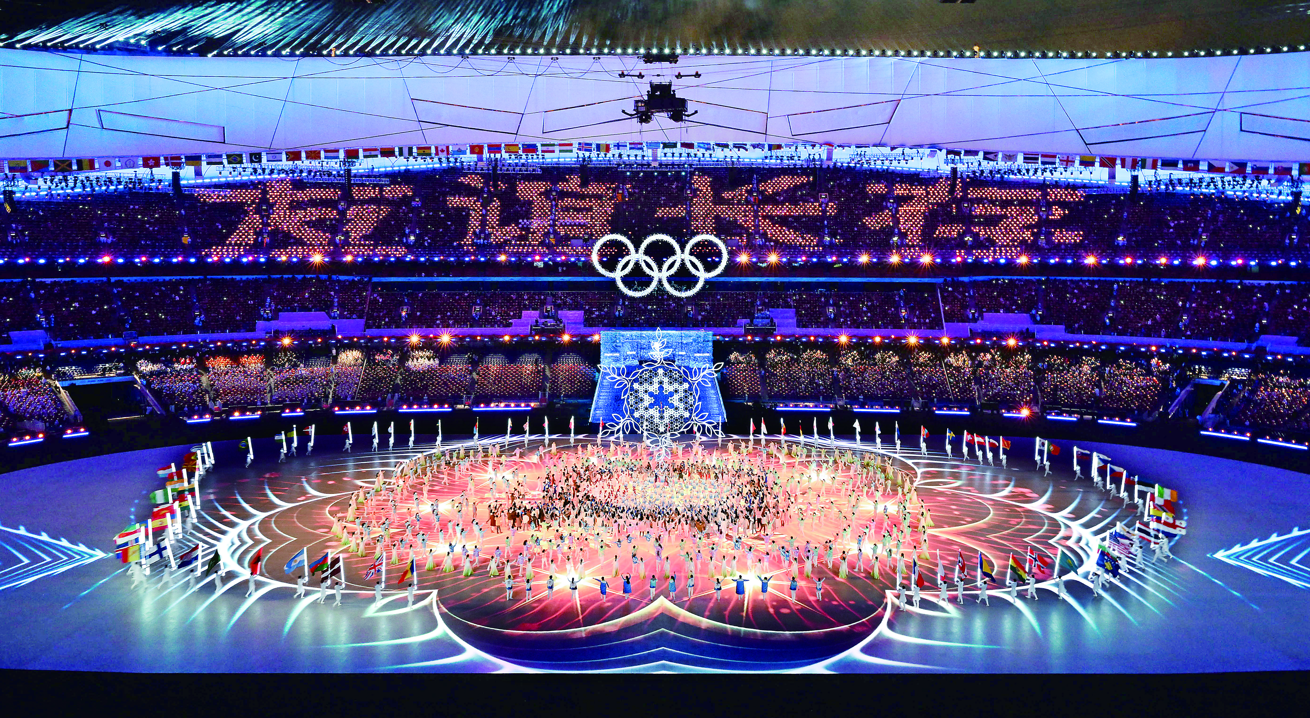 场地上出现了巨大的中国结图案,旗手们手持参加本届冬奥会的91个代表团旗帜步入场内。《欢乐颂》经典乐曲响起,运动员代表入场,全场观众用掌声和欢呼声,向体育健儿们表达热烈的祝贺和由衷的敬意。