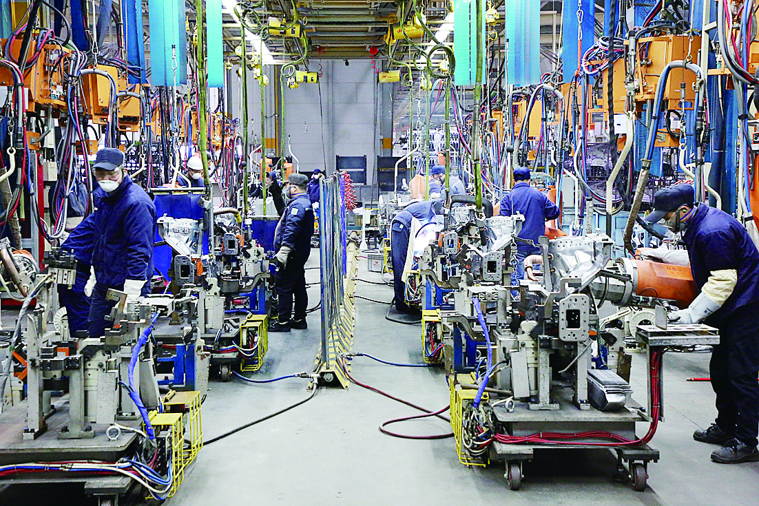 北汽焊装车间现场,2月8日,该车间全年恢复单班300台的节奏。 受访者供图
