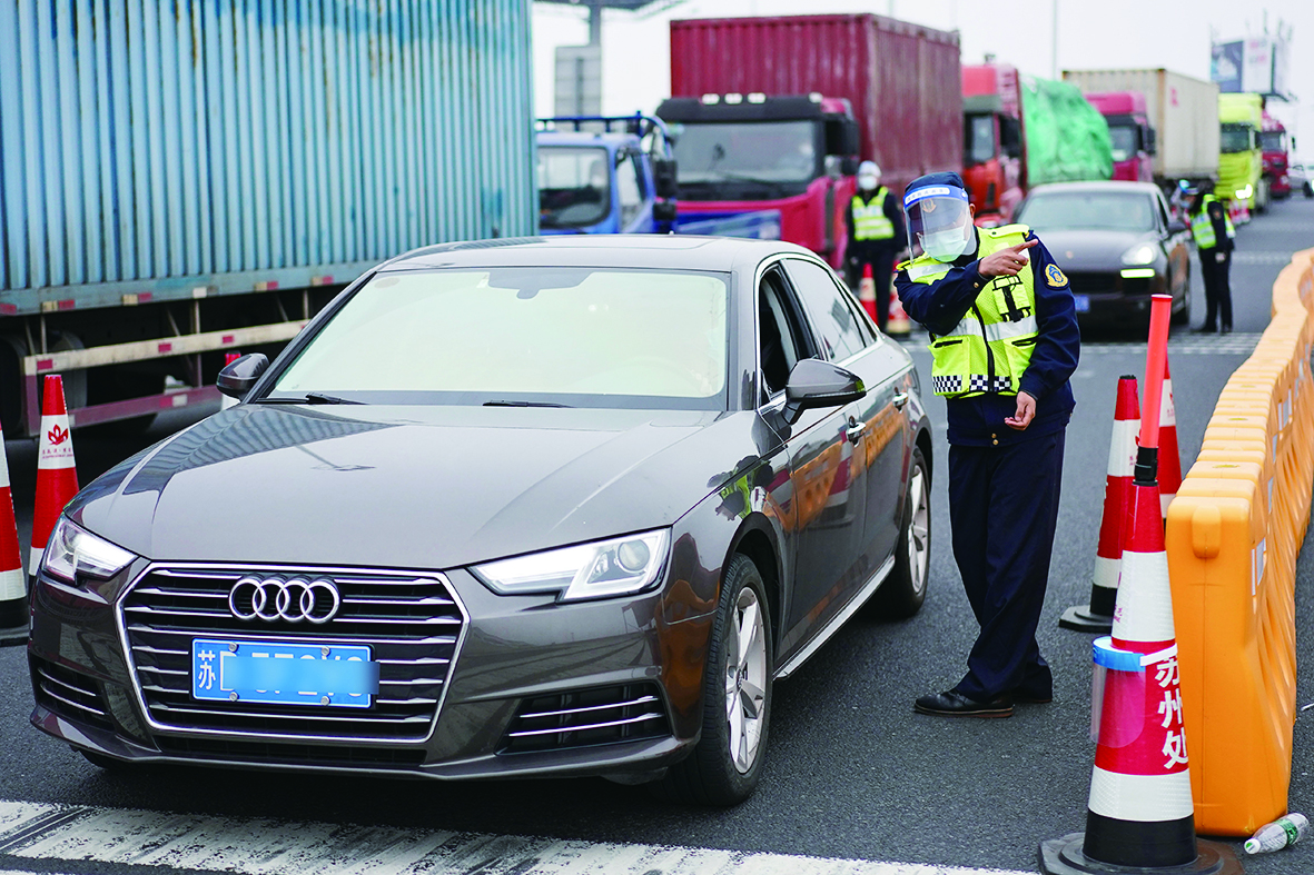 2月15日,在京沪高速公路苏州新区收费站,执法人员劝返不符合条件的车辆。