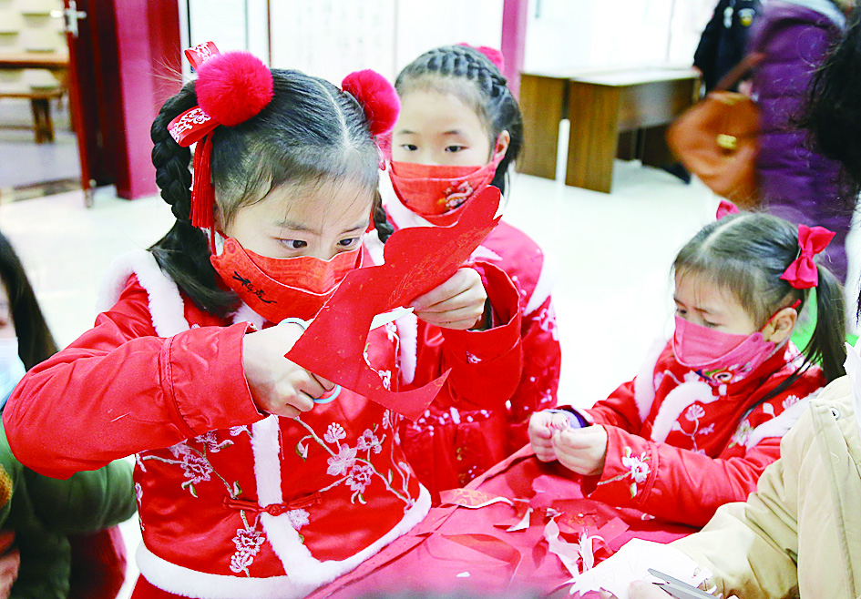 身穿汉服的小朋友正在市文化馆里学习剪纸。 通讯员 供图
