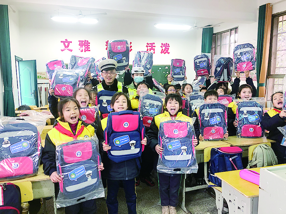 2月17日,芦淞交警大队法宣中队民警来到白关镇中心小学,为学生们开展了“开学第一课”交通安全宣传,鼓励大家牢固树立交通安全意识、掌握交通安全知识、切实提高自我防范能力;同时还给孩子们发放爱心书包。 株洲日报·掌上株洲记者/沈全华 通讯员/卜妍 摄