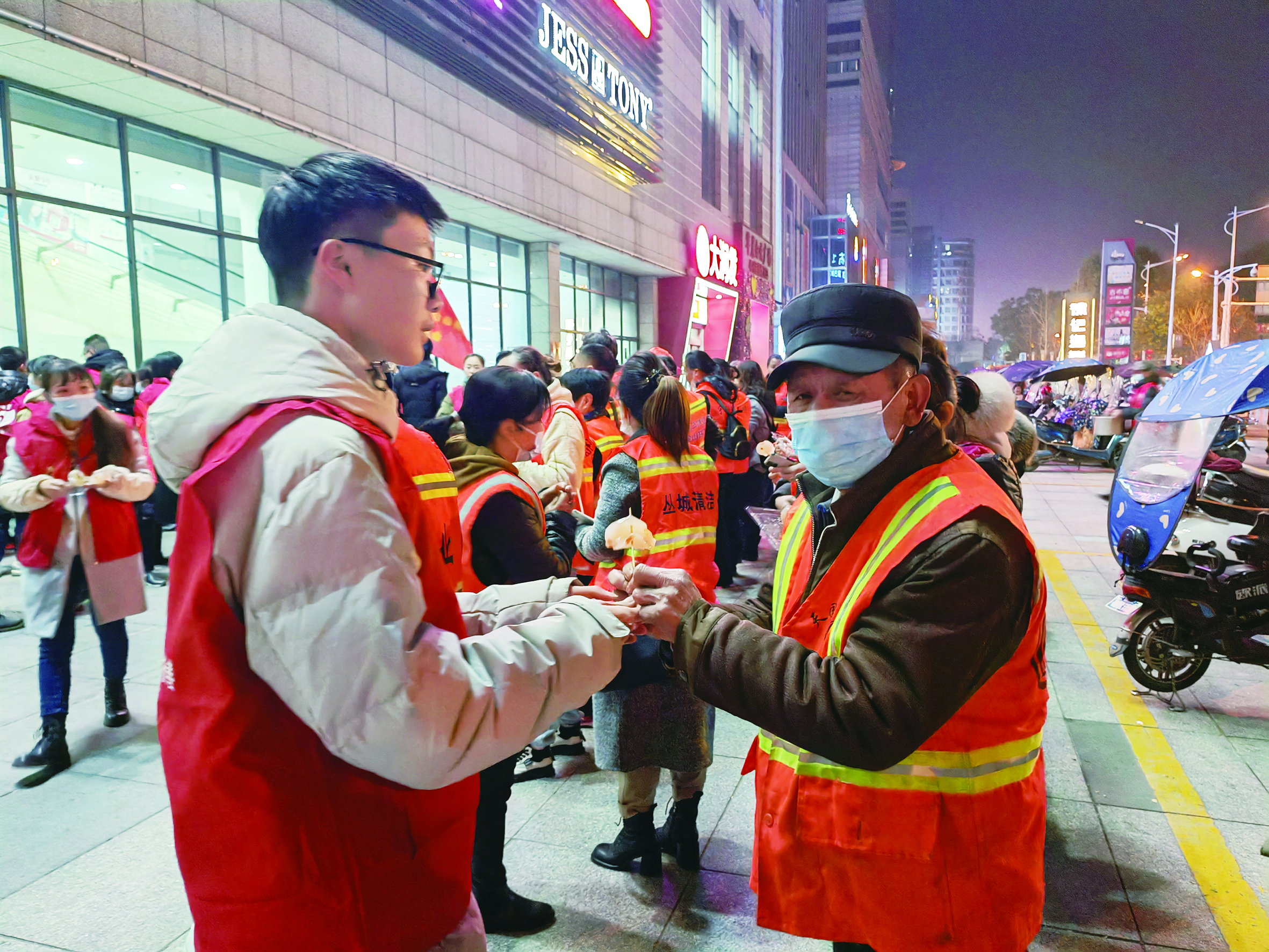 2月15日下午6点,在西子花园社区党支部、合泰非公党支部以及众多社会爱心人士的支持与赞助下,民间爱心组织“株洲晓雷爱心工作室”的志愿者们冒着寒风,在荷塘区大润发商场前坪架起厨具,现场将一碗碗热气腾腾的汤圆、糕点送到辛勤工作的50多名一线环卫工人手中,同时还给这些城市“美容师”们发放了棉袜、手套、护肤品等爱心物资。