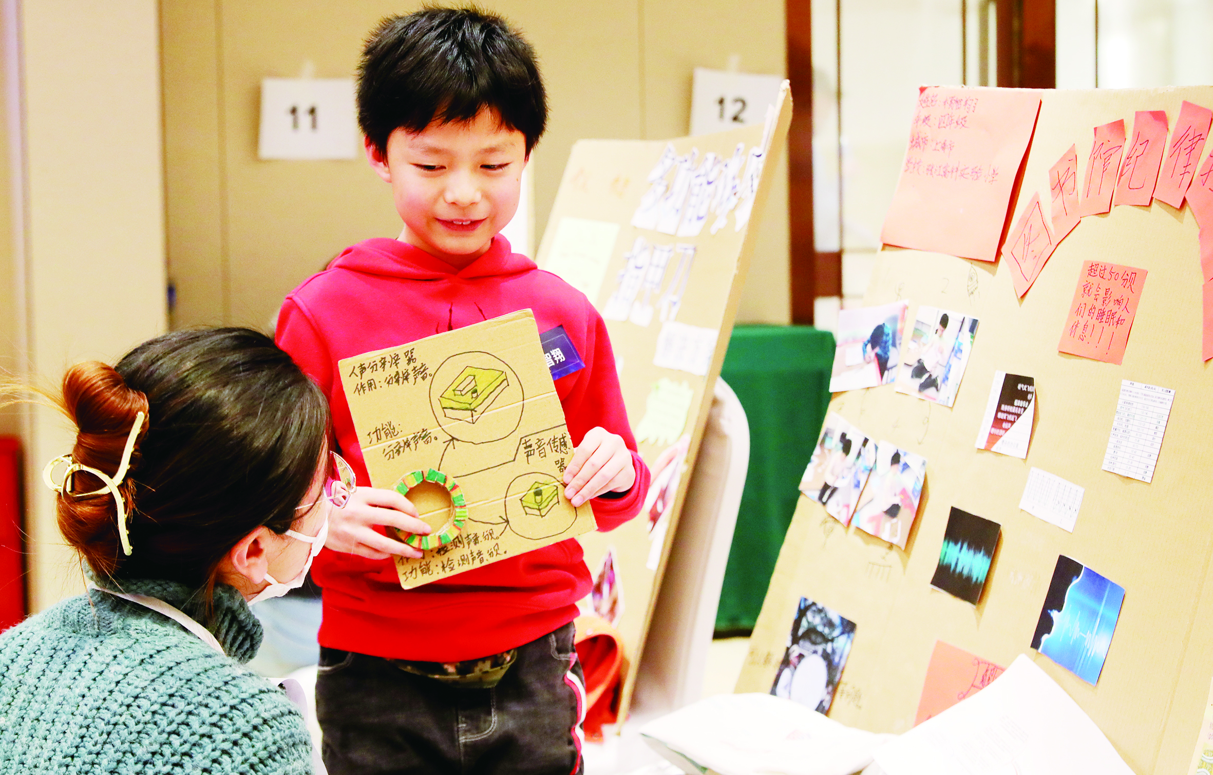 2月19日,一名小朋友向评委介绍他发明的图书馆纪律检测设备。