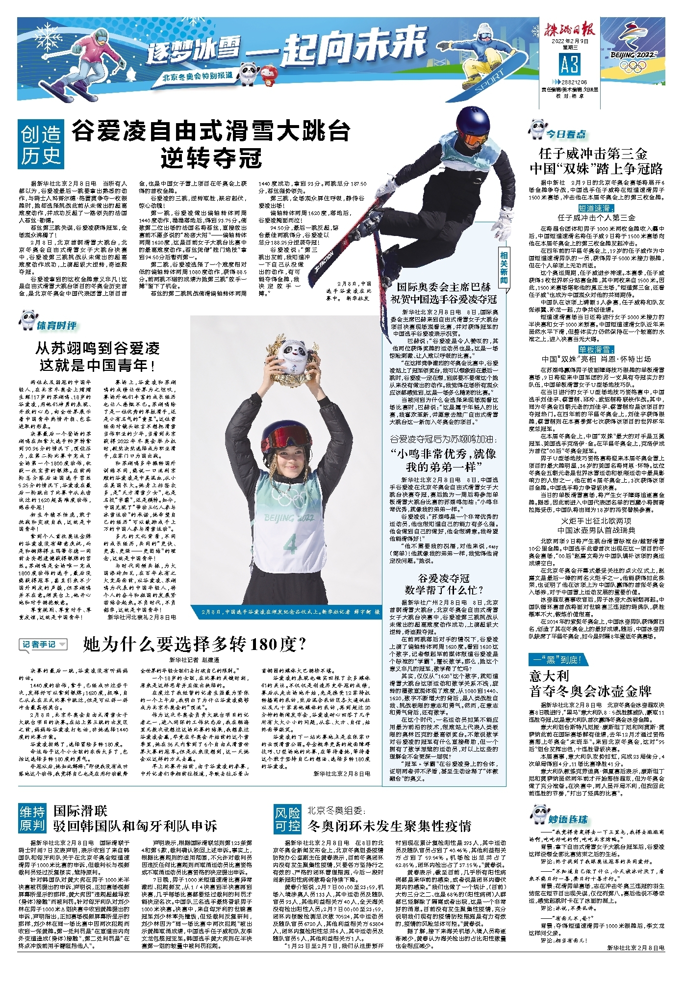 2月8日,北京首钢滑雪大跳台,北京冬奥会自由式滑雪女子大跳台决赛中,谷爱凌第三跳挑战从未做出的超高难度动作成功,上演超级大逆转,奇迹般夺冠。