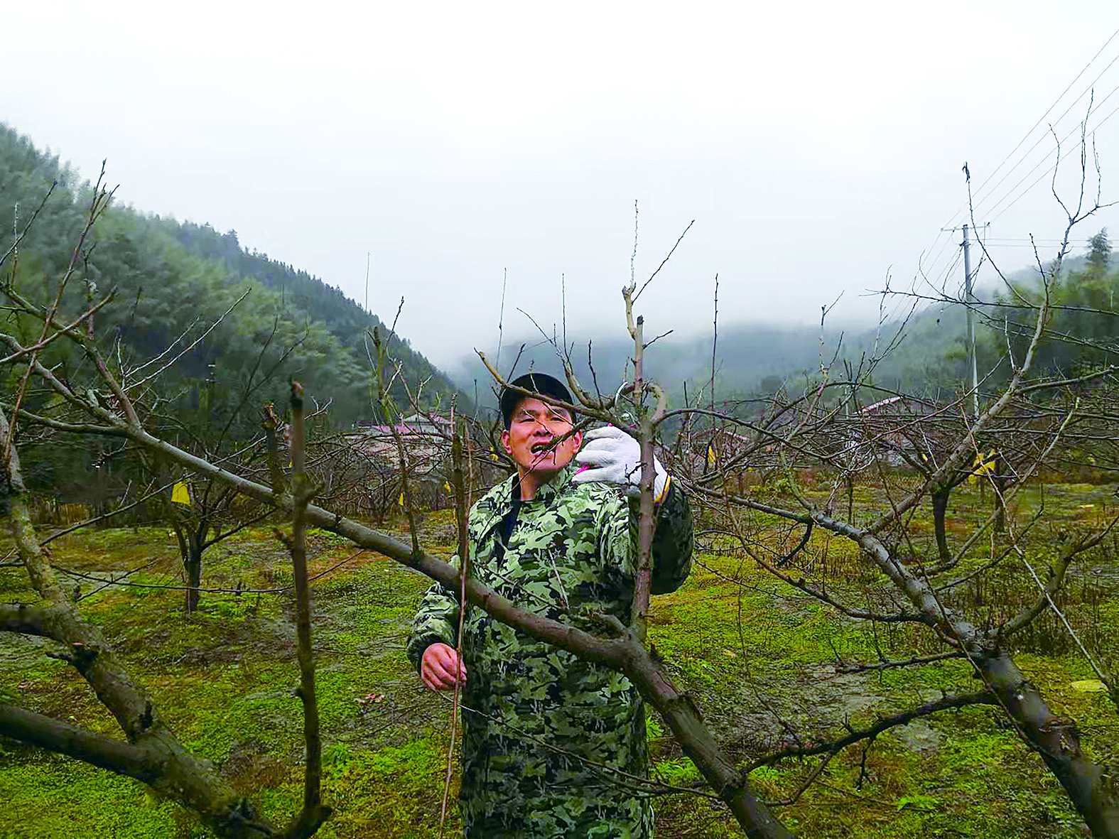 2月18日,趁着柰李树萌芽前,42岁的黄松贵带着工具来剪枝。他费力地踮起脚尖,伸长左手,够到树高处的一根枝条,拉低后麻利地往嘴里一夹,又用左手从下垂的右手中取回剪枝钳,随着“咔嚓”的清脆声,休整好的枝条瞬间弹回原位。站在这片自己亲手栽培的柰李园里,望向不远处的魔芋和水苔种植地,他开心地笑了……