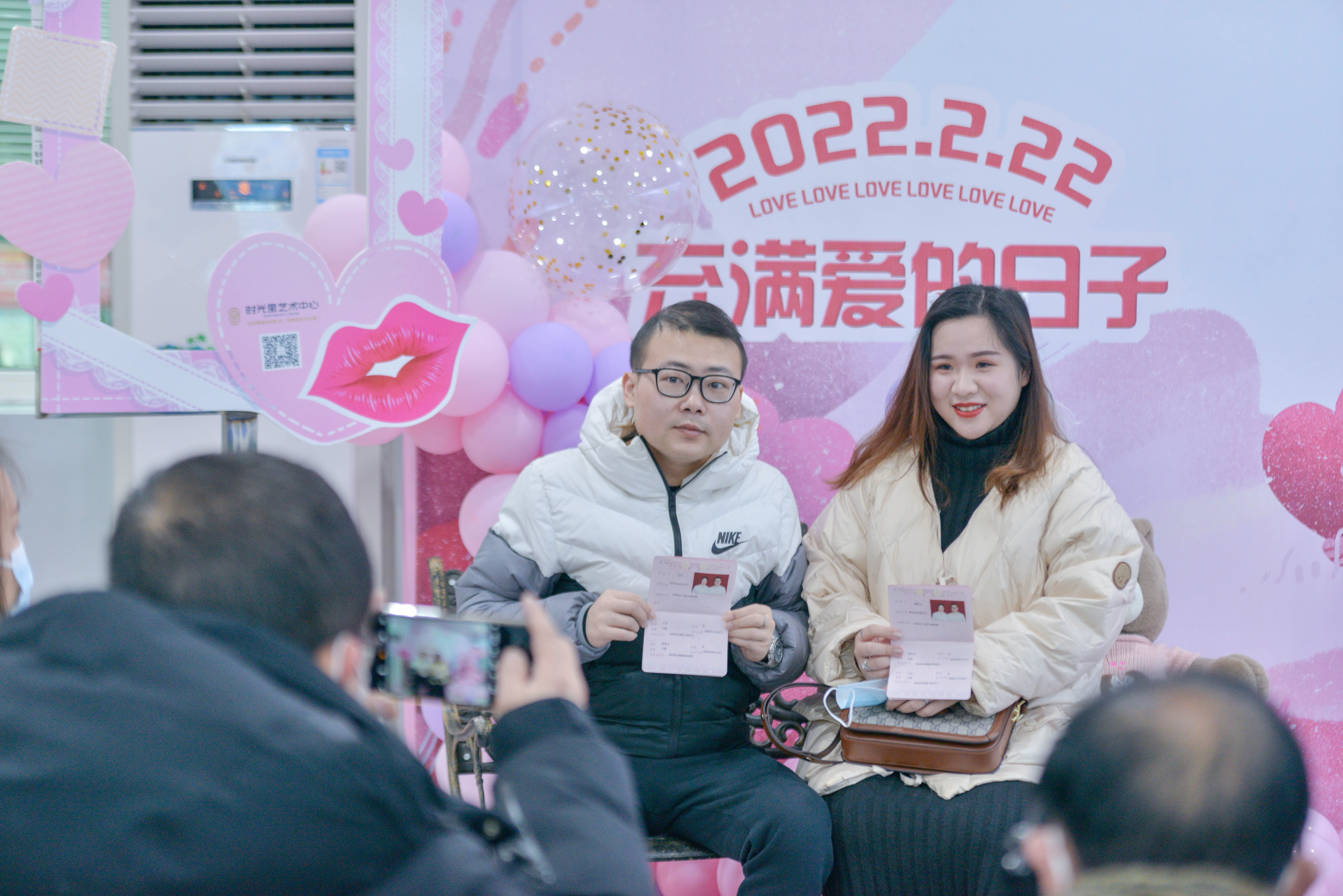 登记处布置得温馨又不失庄重,粉色气球拱门和一面画着卡通情侣、写着“2022.2.22 充满爱的日子”的主题彩绘板引人注目,彩绘板前还放了长椅和玩具人偶,吸引了不少新人合影留念。