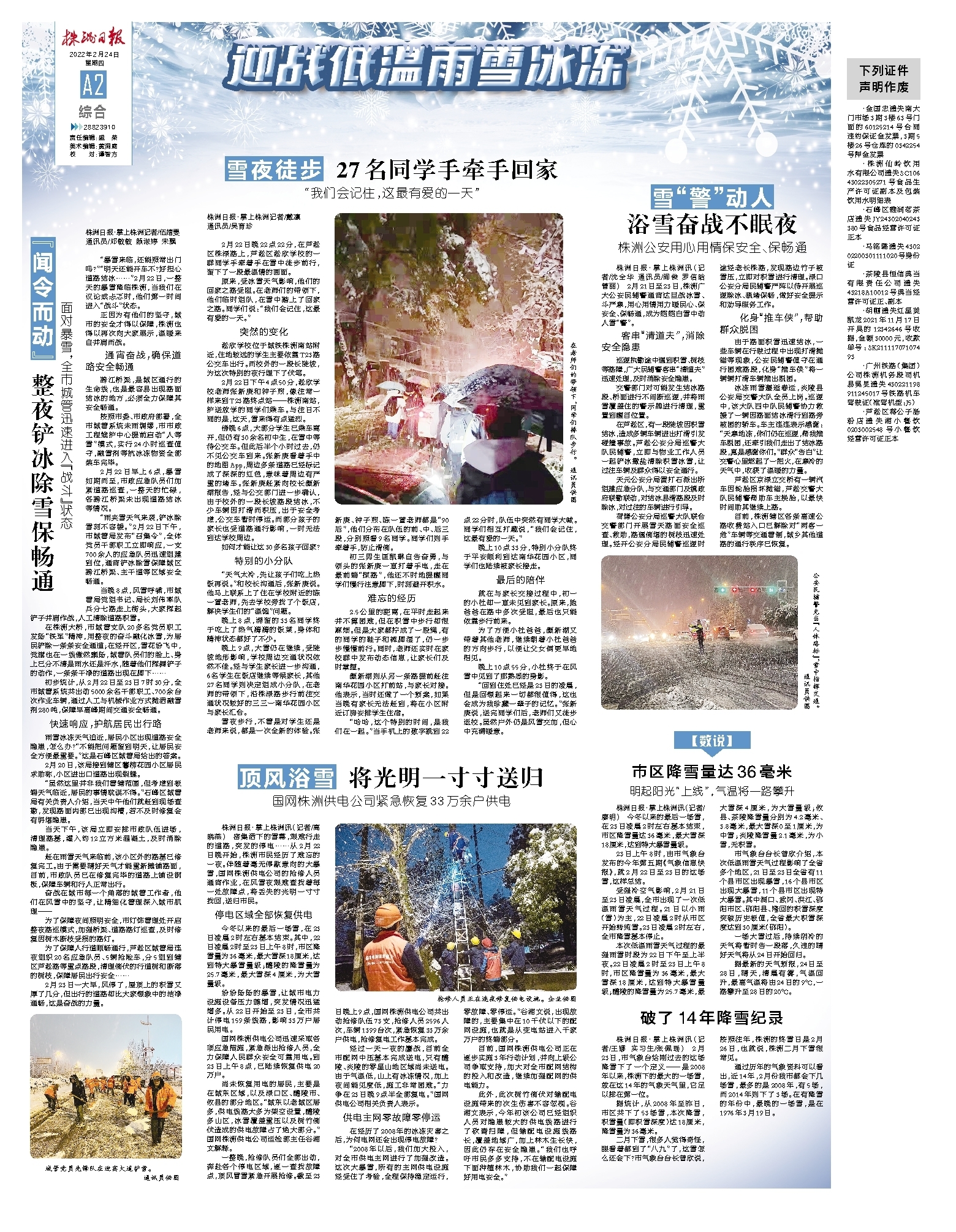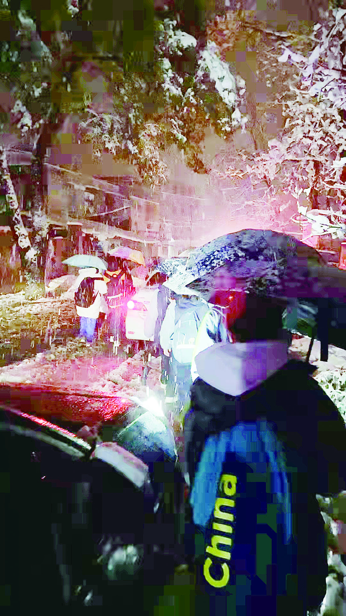 晚上9点,大雪仍在继续,受陡坡地形影响,学校周边交通状况依然不佳。经与学生家长进一步沟通,6名学生在饭店继续等候家长,其他27名同学则决定组成小分队,在老师的带领下,沿株渌路步行前往交通状况较好的三三一南华花园小区与家长汇合。