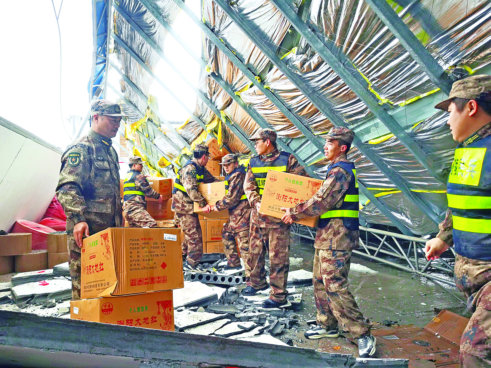 2月23日,受强降雪积压影响,“中意鞭炮”一处占地1000平方米的仓库突然坍塌,库房内价值约100万元的烟花鞭炮或将受潮。得知情况后,负责联点挂钩的醴陵市人武部领导带领工作组第一时间抵达现场,察看灾情。见库房受损严重,屋面倾斜,棚顶坍塌漏水,随时有第二次坍塌的风险,工作组当即叫停正在救援的企业员工,并请专业人士对隐患进行排查,对危险部位进行加固。随后,又紧急调度该市左权民兵应急分队,帮助受灾企业抢运转移烟花鞭炮。