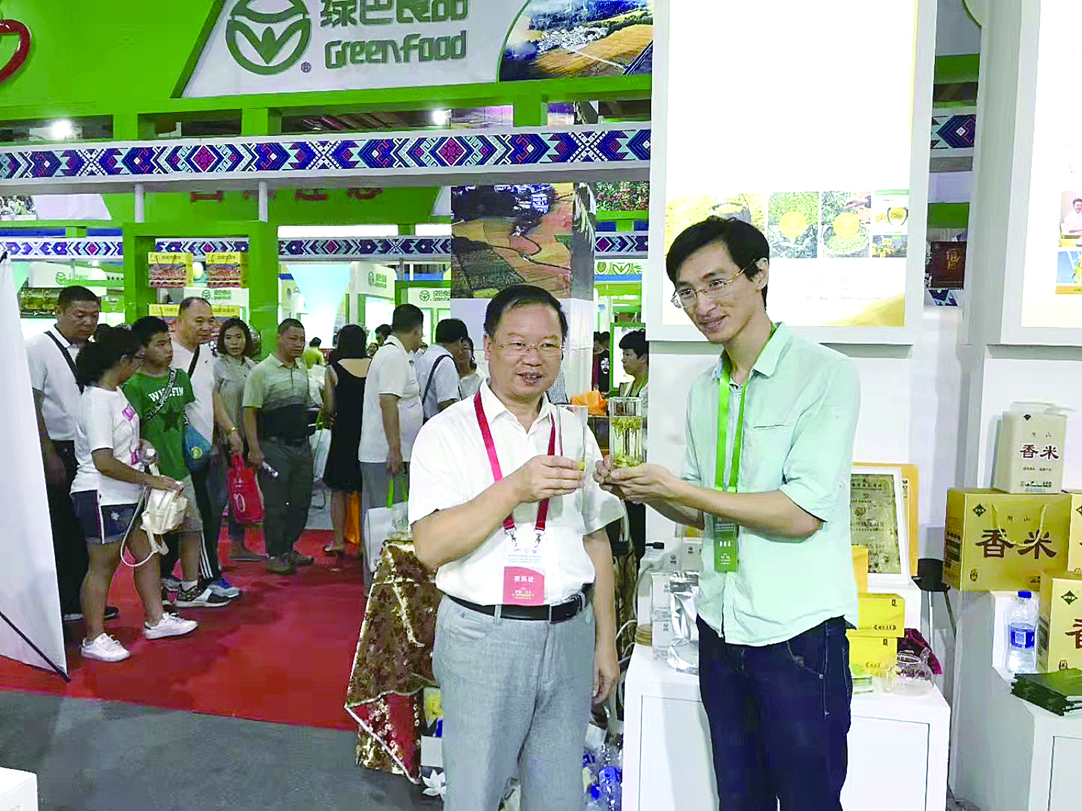 王航宇(右)在展会上推介公司的绿茶品牌。 受访者供图