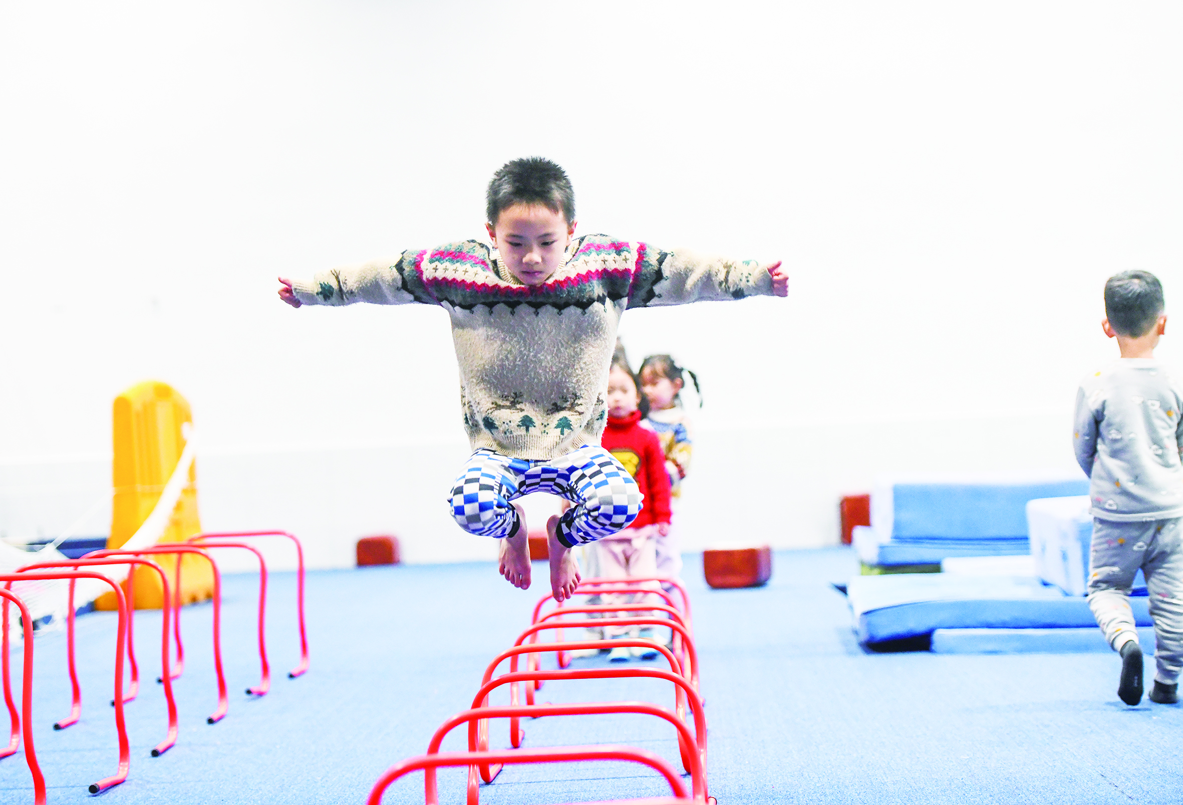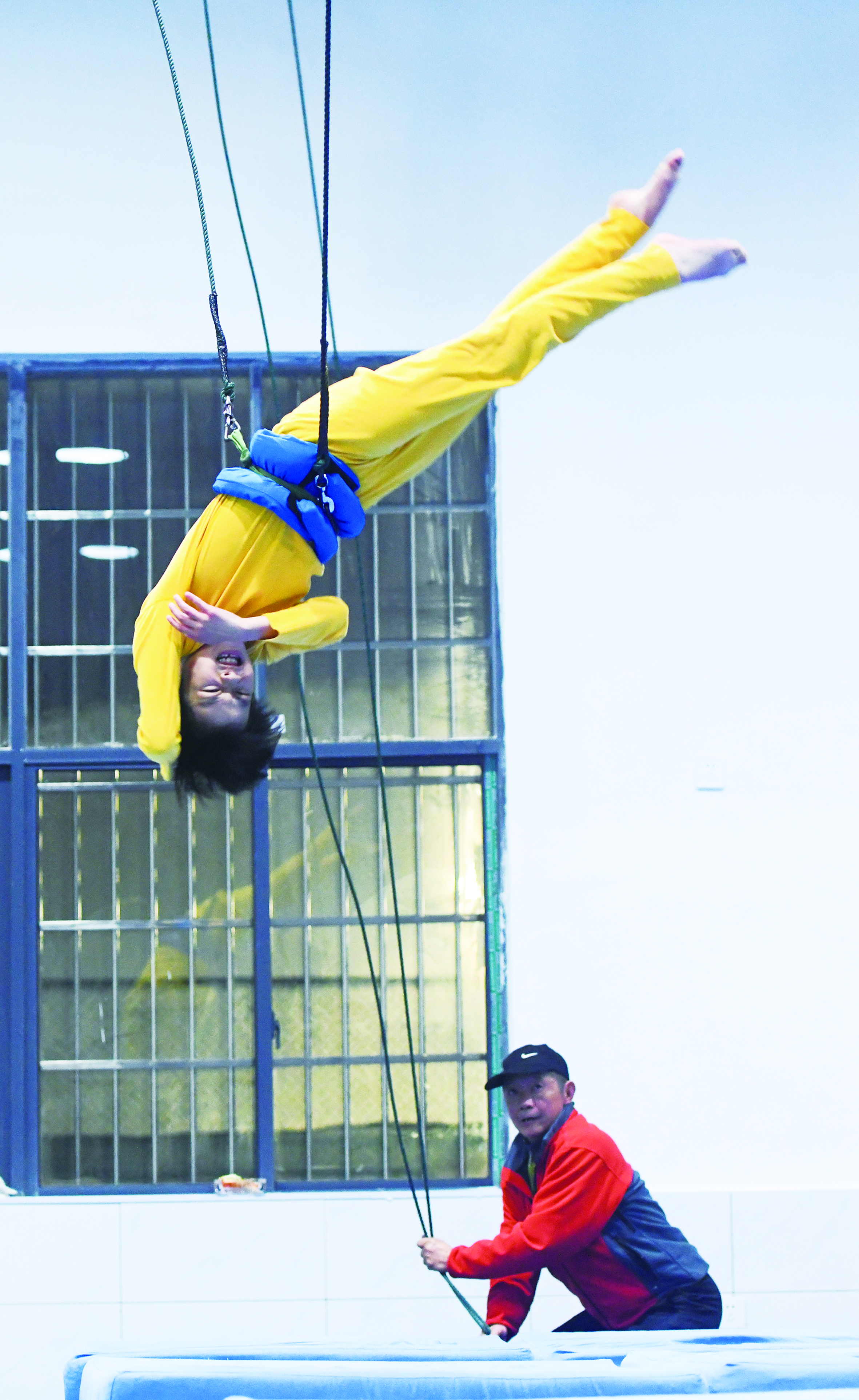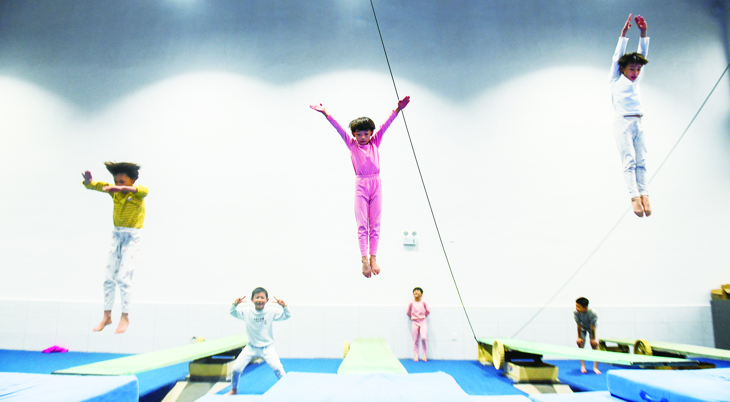 初学阶段,孩子们通过保护带练习翻腾动作。