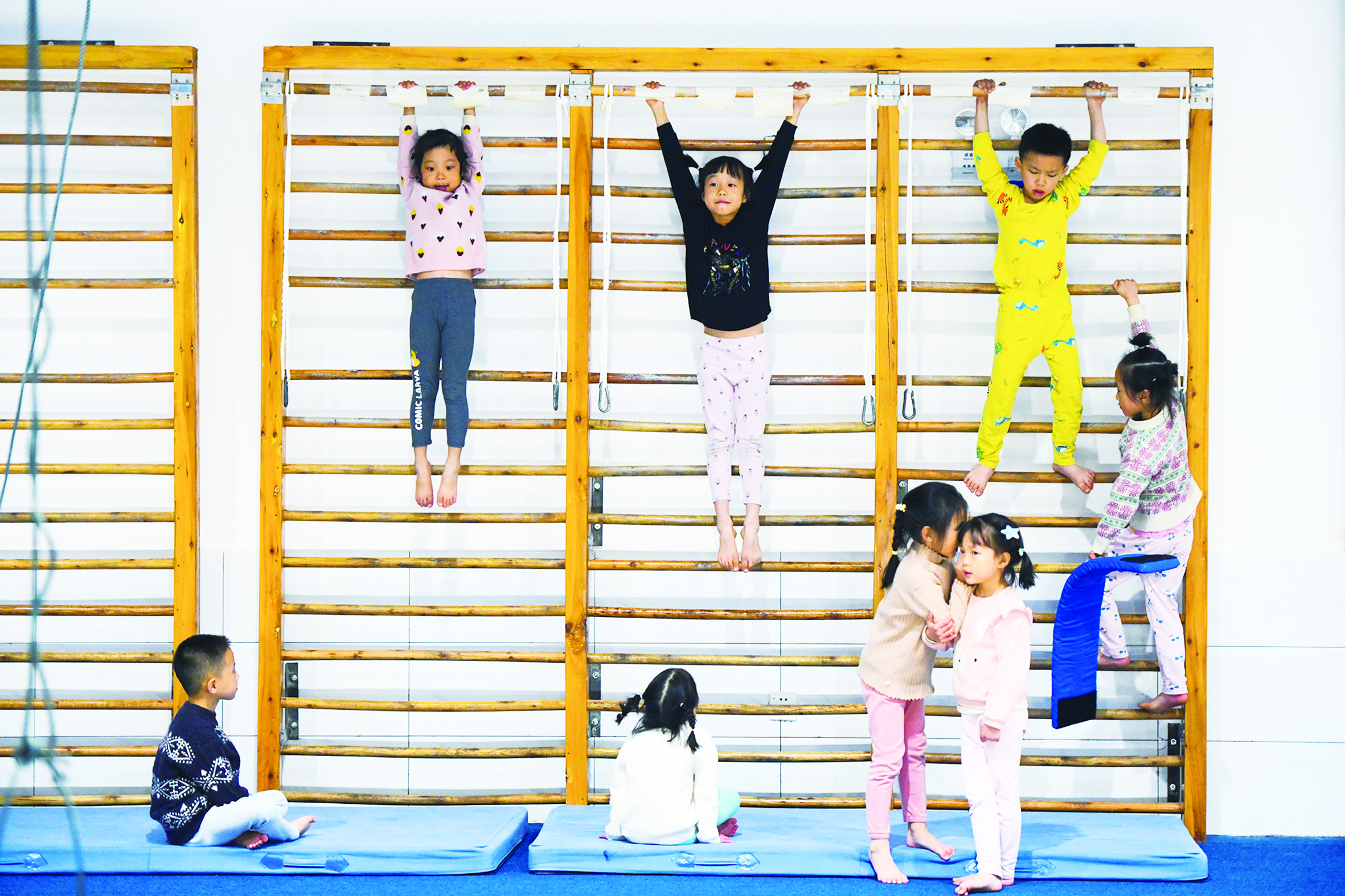 肋木举腿练习中,两位小朋友忍不住说起了悄悄话。