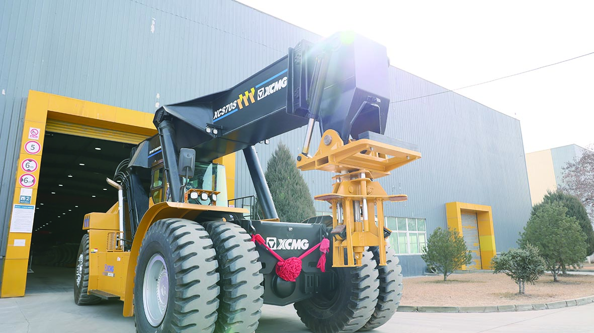 正面吊一般指正面起重机。此次交付的风电正面吊XCS70S,是目前国产最大吨位,额定载荷70吨,吊装应用范围更广。较之汽车吊等传统风电轮毂吊装方法,XCS70S专业针对大型风电轮毂等设备吊装,配置专属吊具,使用更加方便灵活,吊装搬运效率大幅提升。此外,整机还标配自动灭火装置、胎压监测系统、360全景影像系统,确保驾乘作业安全可靠。