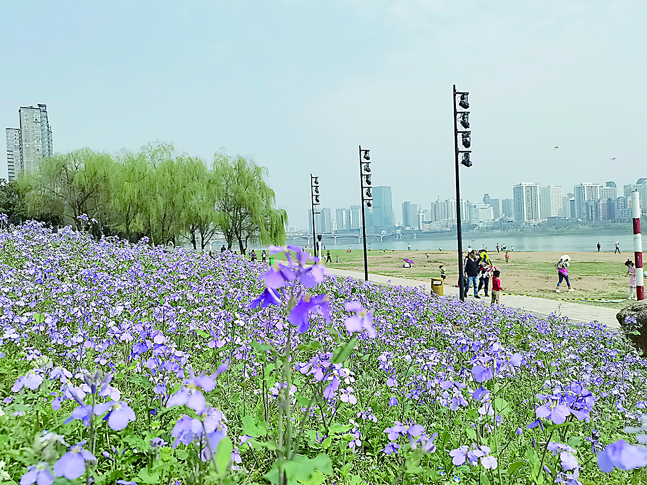 ◀河西湘江风光带沙滩广场下方,满坡的二月兰花开正艳。 通讯员 供图